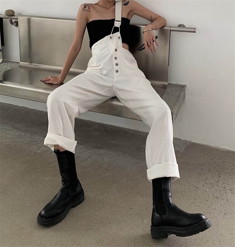 ジーンズ ハイウエスト ストレートレッグ デザインセンス サロペット ワイドパンツ