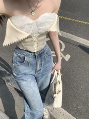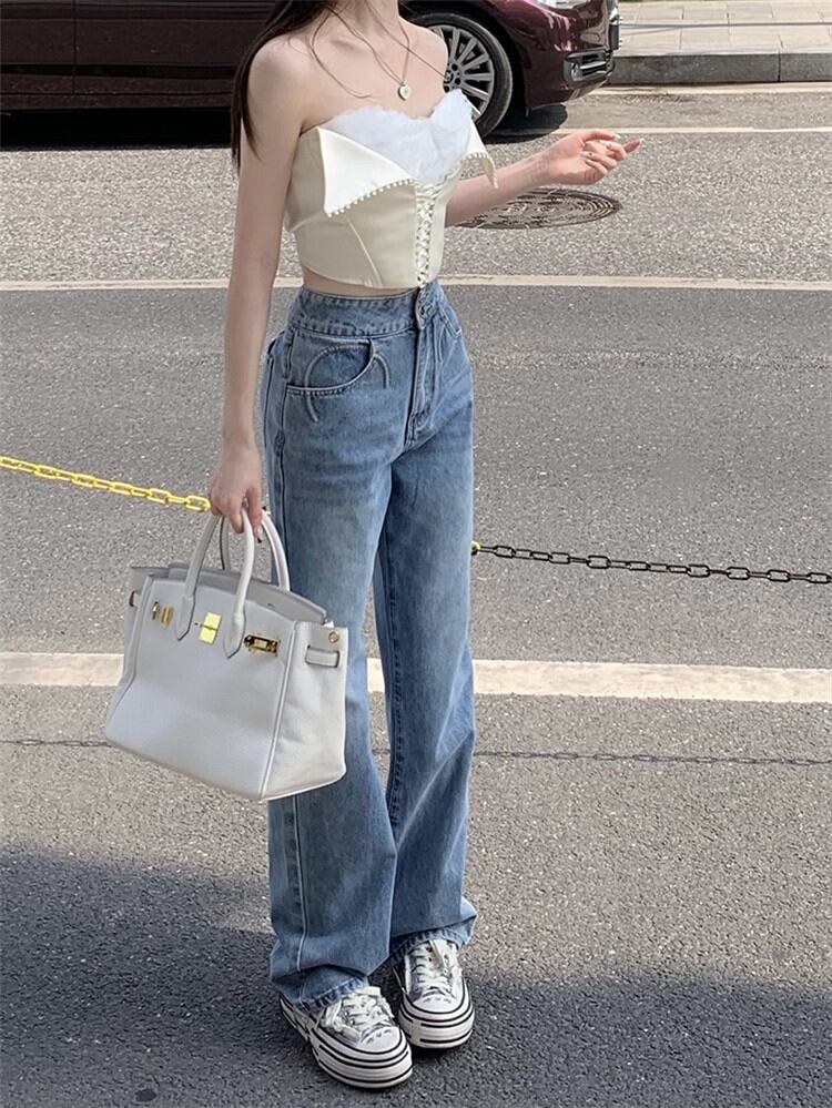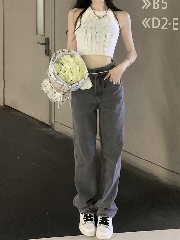韓国ファッション レター 縫付 ハイウエスト ジーンズ 女性 スリム ストレート ワイドレッグパンツ