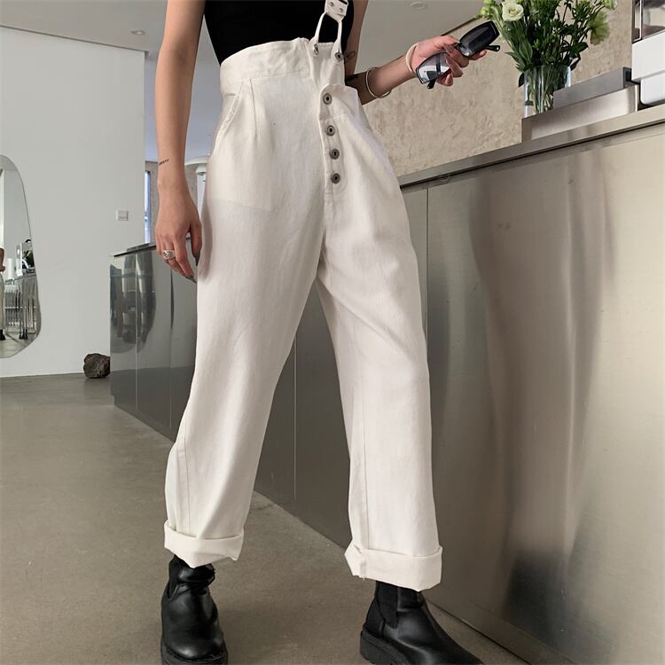ジーンズ ハイウエスト ストレートレッグ デザインセンス サロペット ワイドパンツ