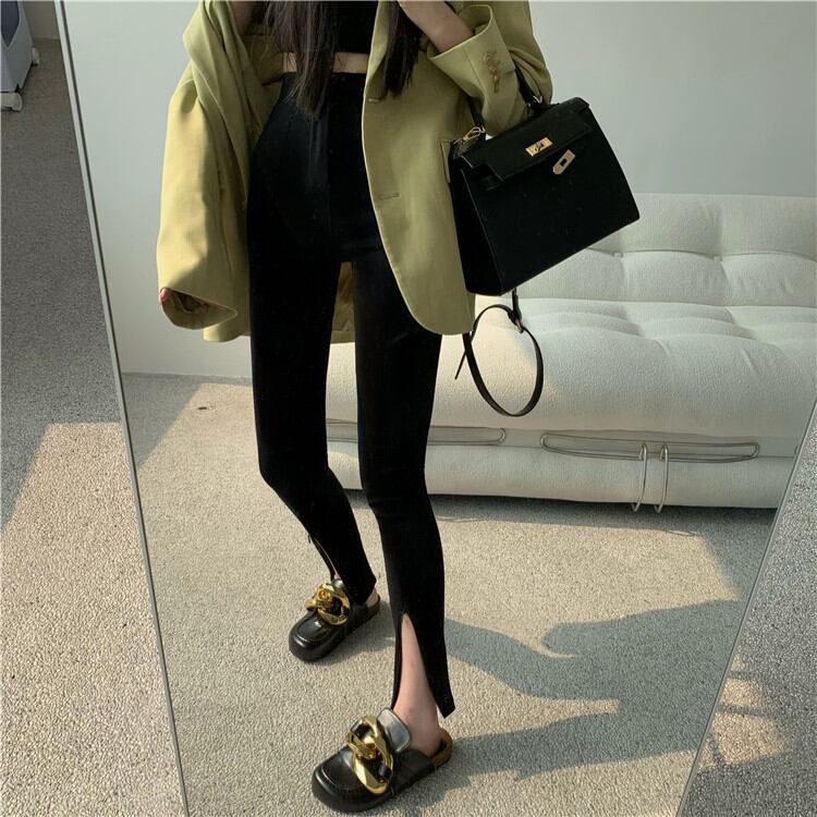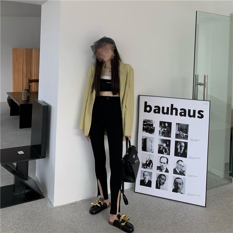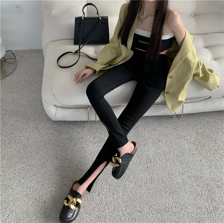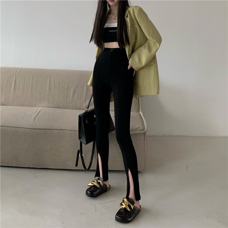 ジッパー スプリット スリム ストレッチ ペンシルパンツ ブラック ハイウエスト