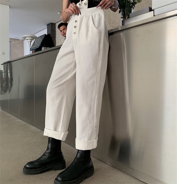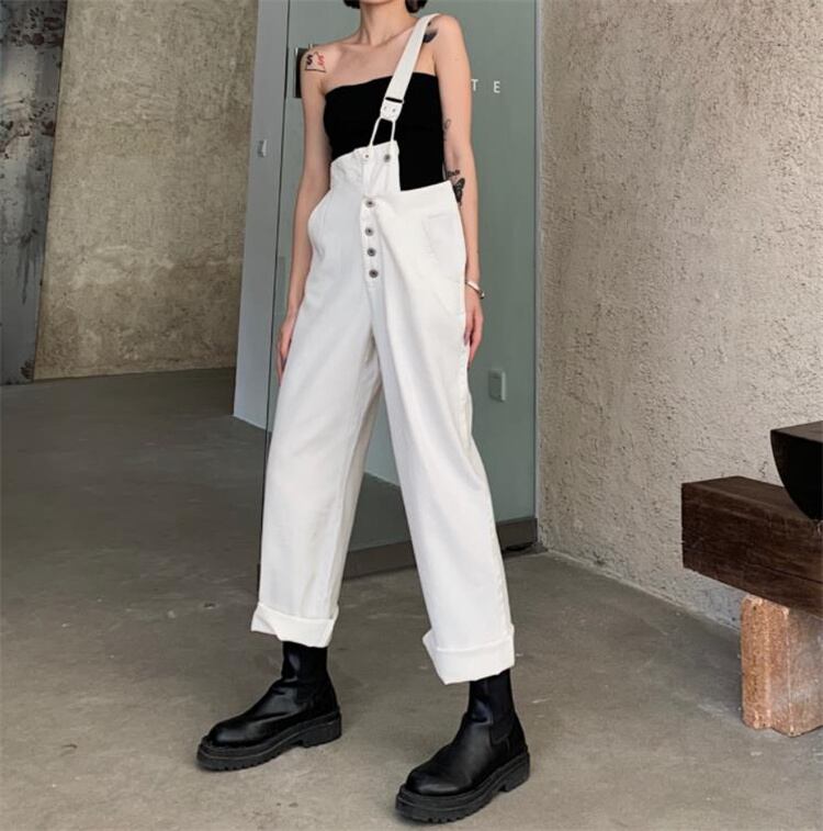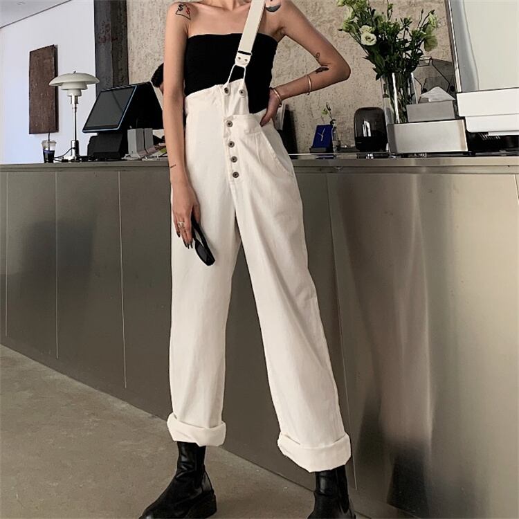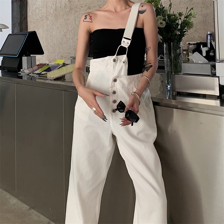 ジーンズ ハイウエスト ストレートレッグ デザインセンス サロペット ワイドパンツ