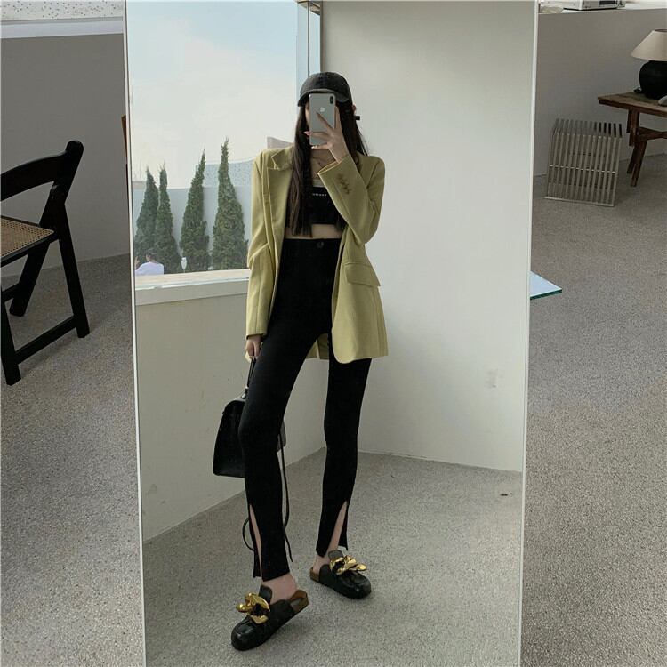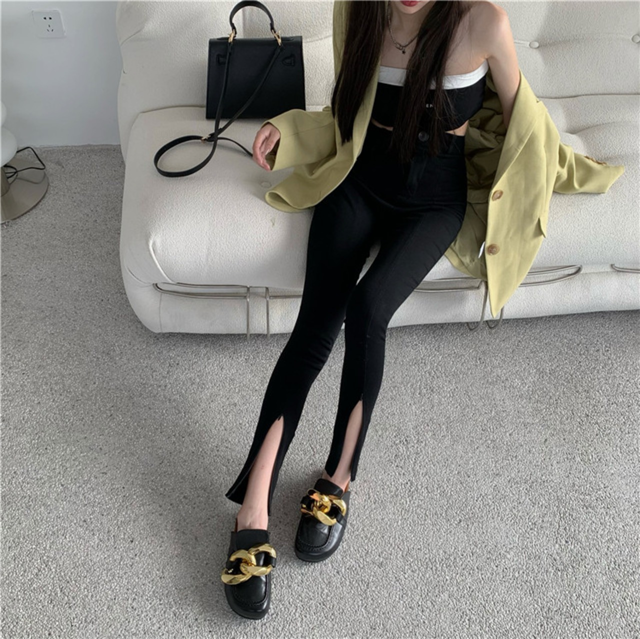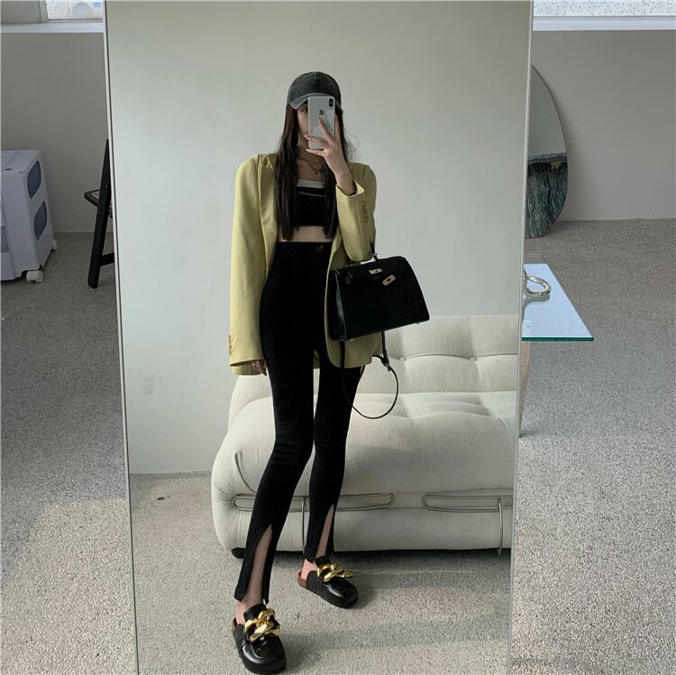 ジッパー スプリット スリム ストレッチ ペンシルパンツ ブラック ハイウエスト