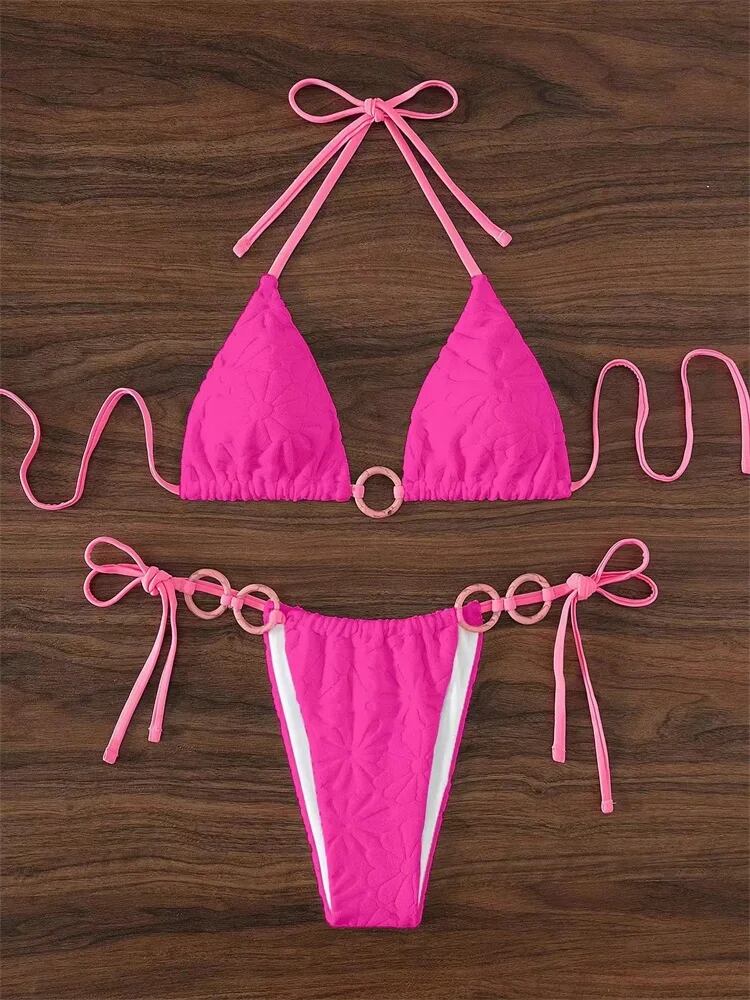 女性の白いコントラストリングリンクされたマイクロ水着、セクシーな三角形のビキニ、クロスオーバーひも水着、ビーチスーツ、サイド、2024 ビキニ Tシャツ T240619002754_01 | DOKO-ME