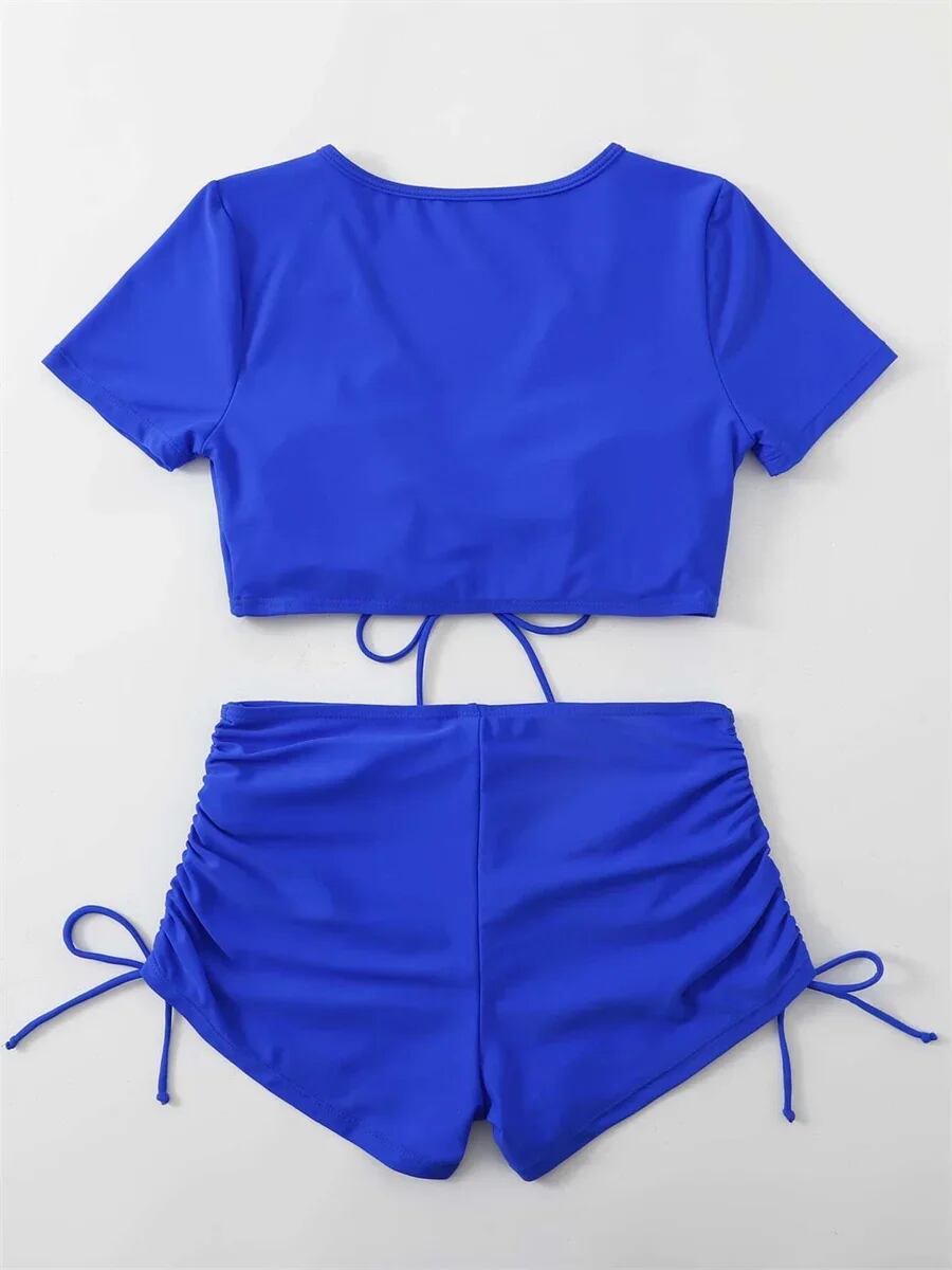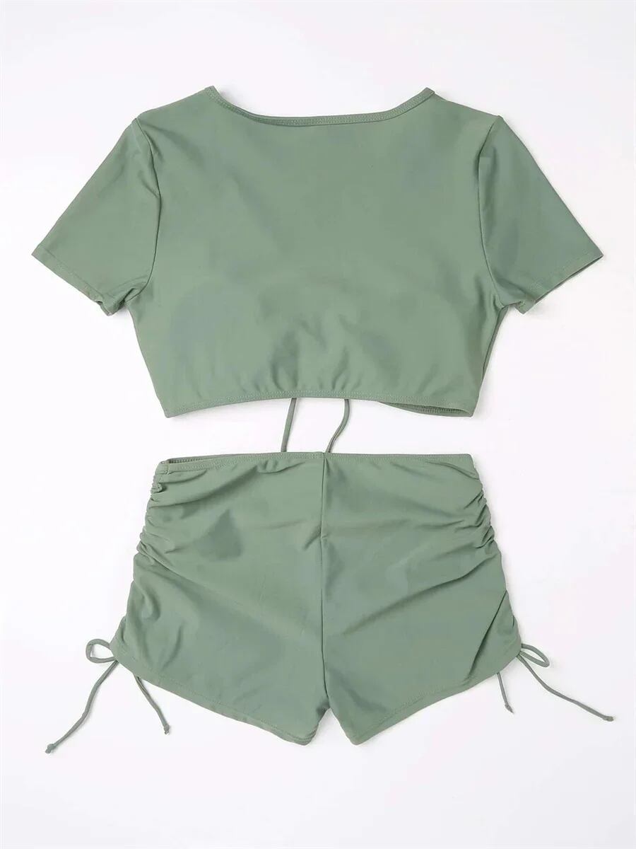 引きひも付きの女性用ビキニ,半袖のツーピースの女性用水着,プリーツ付きのハイウエスト水着,グリーン,ブラック,2022 ビキニ Tシャツ T240619003046_01