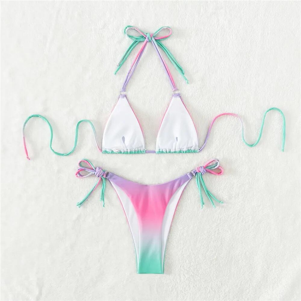 女性のためのセクシーなレインボーグラデーション水着、弦ホルタービキニ、マイクロエクストリームビキニ、レースアップひも水着、水着、ビキニセット、2022 ビキニ Tシャツ T240619010059_01 | DOKO-ME