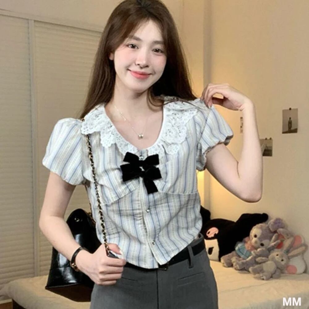 Rimocy 女性のプレッピースタイルのプレッピースタイルの蝶ネクタイ半袖シャツ、レース、ラウンドネッククロップトップ、女性のシングルブレストブラウス、夏 Tシャツ シャツ T240619143106_01 | DOKO-ME