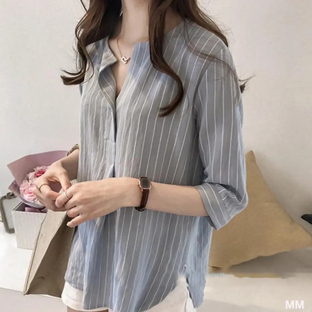 女性用ストライププリントTシャツ,Vネック,半袖,エレガントなサマーウェア,ストリートウェア,3/4コレクション Tシャツ シャツ T240619143108_01