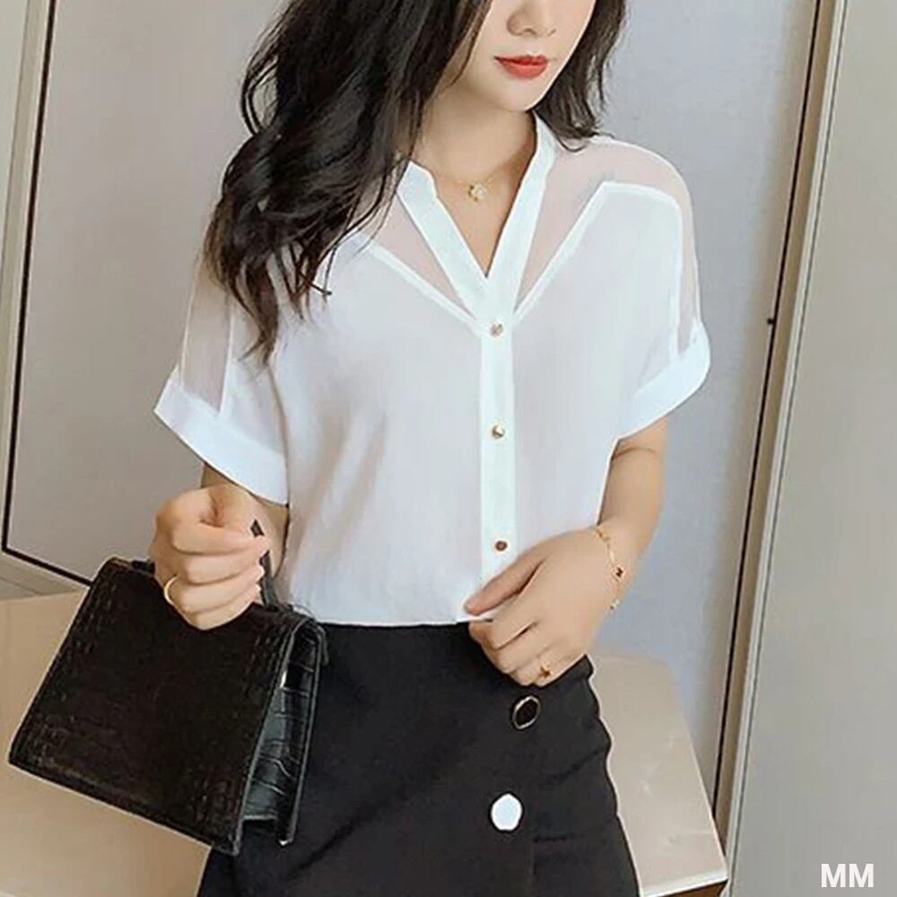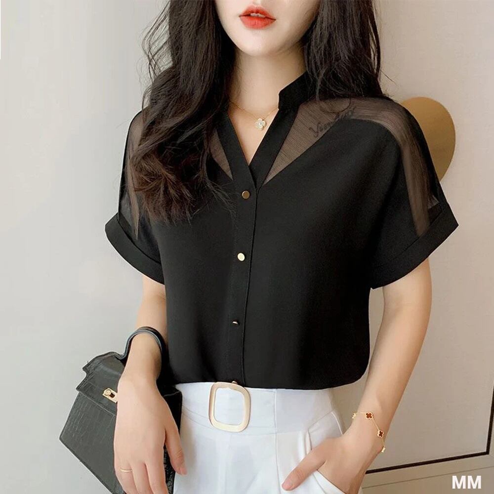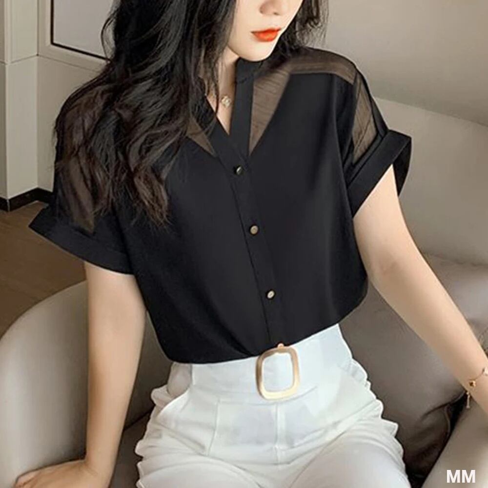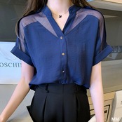 女性用Vネックメッシュパッチワークシフォンシャツ、半袖ブラウス、カジュアルトップ、オールマッチプルオーバー、単色、エレガントファッション、夏 Tシャツ シャツ T240619143124_01 | DOKO-ME