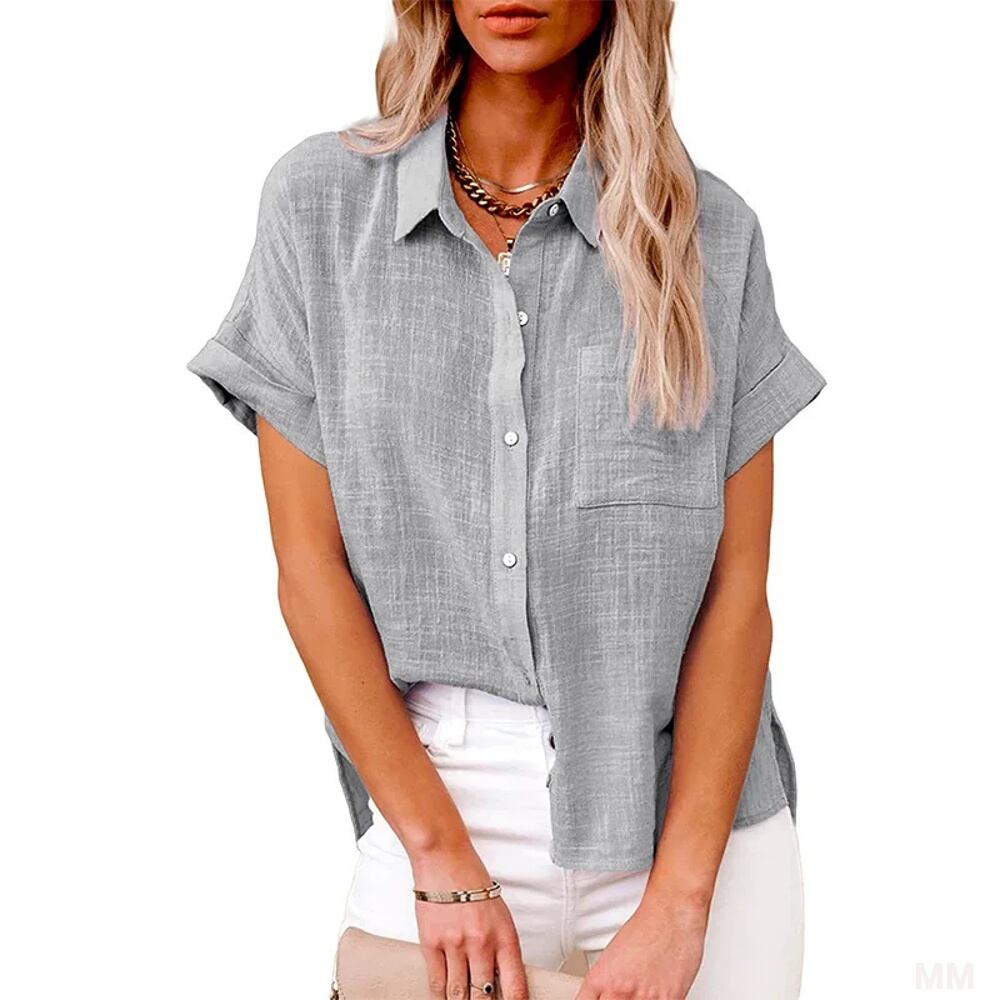 女性用半袖リネンとコットンのルーズブラウス,ボタン付き無地シャツ,カジュアルファッション,エレガントなサマーシャツ,新しいシャツ,2024 Tシャツ シャツ T240619143337_09 | DOKO-ME