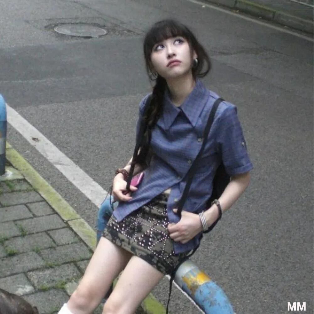 女性用半袖ブルーチェックシャツ,ルーズフィット,ラペルカラー,ソフト,クール,マッチ,e girl,y2k,夏,新しい,2024 Tシャツ シャツ T240619143430_01 | DOKO-ME