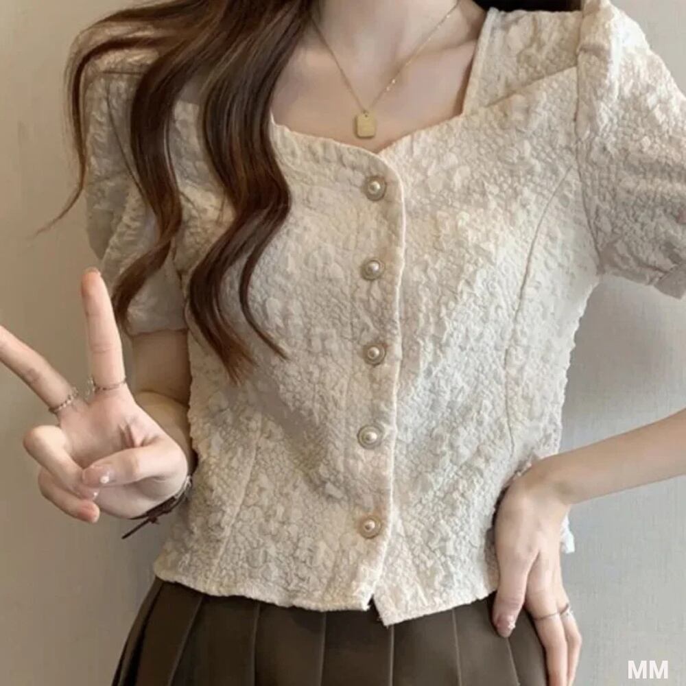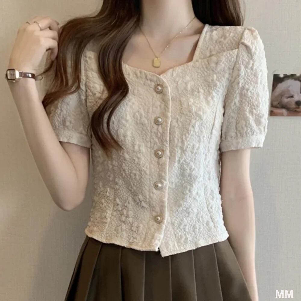 女性のためのレトロな韓国スタイルの柔らかいボタンのシャツ,スクエアカラー,無地,半袖,シックなy2kトップス,エレガントなファッション,夏,新しい,2024 Tシャツ シャツ T240619143446_02 | DOKO-ME