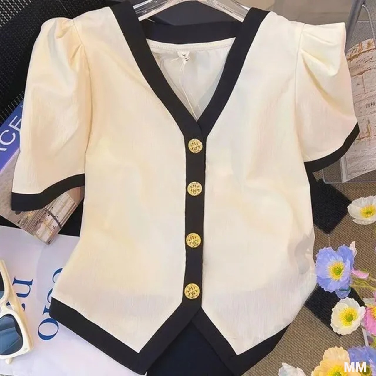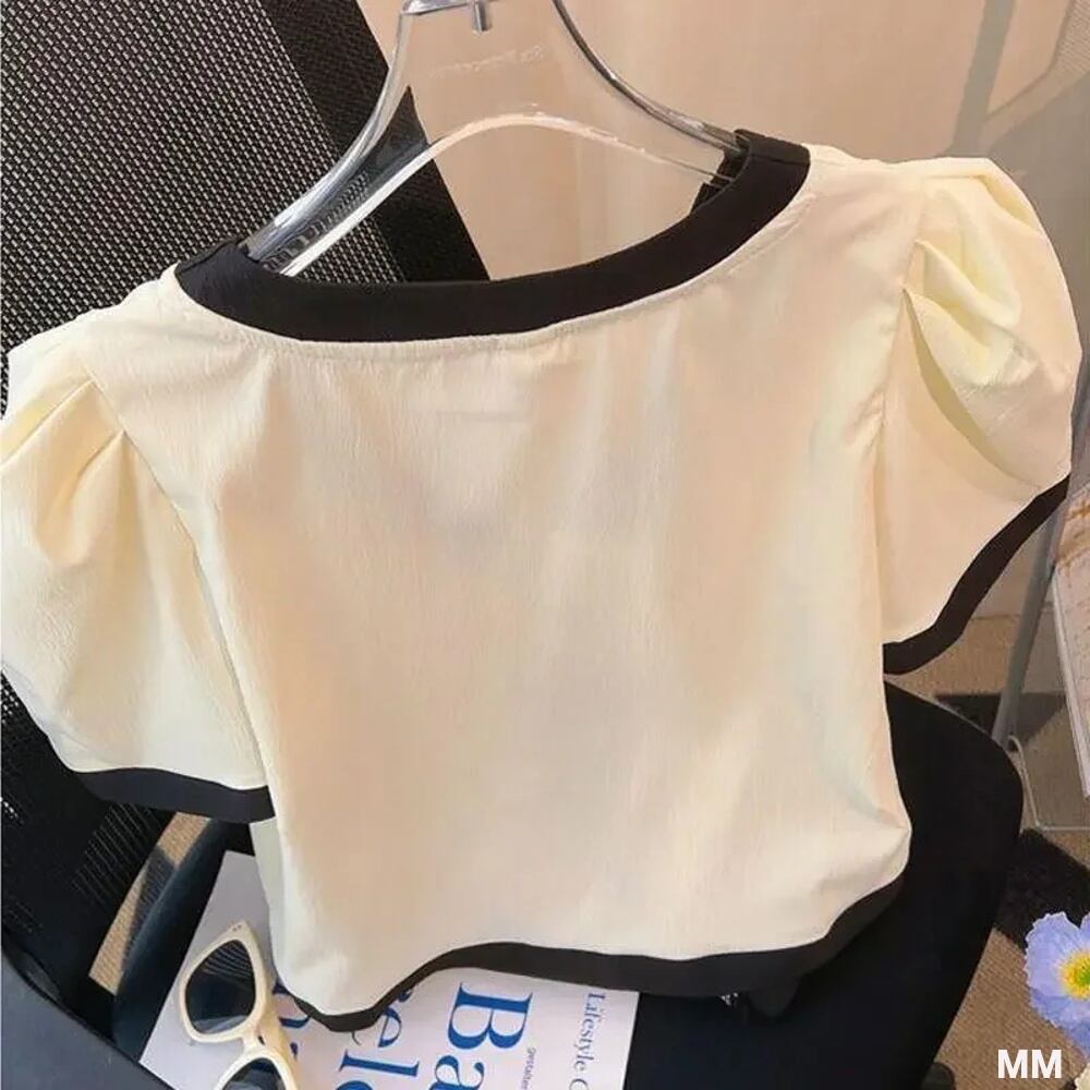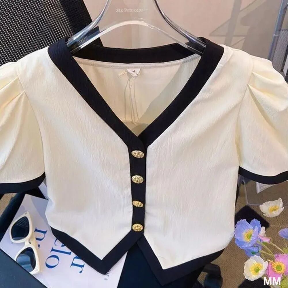 女性用半袖スプライスシャツ,フレンチスタイルシャツ,黒,白,ルーズ,多用途,デザイン,ファッショナブル,夏用 Tシャツ シャツ T240619143455_01