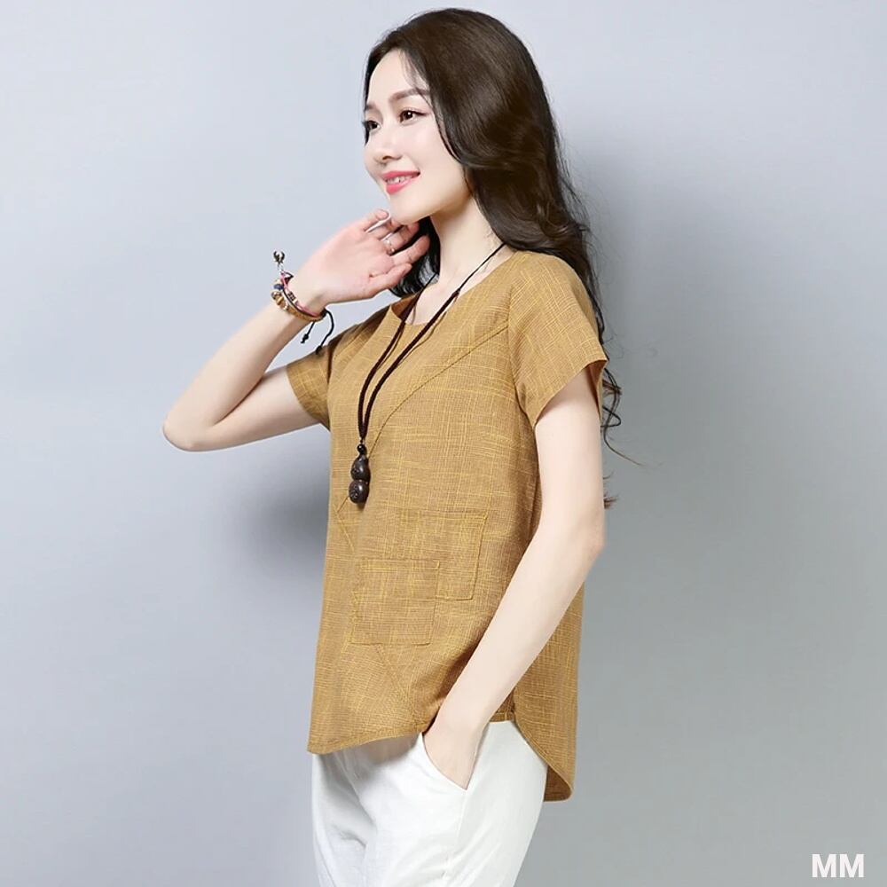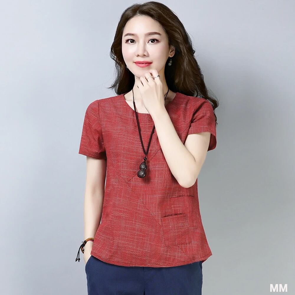 半袖リネンとコットンのサマーブラウス,女性用ヴィンテージスタイルシャツ,2023 Tシャツ シャツ T240619143549_02