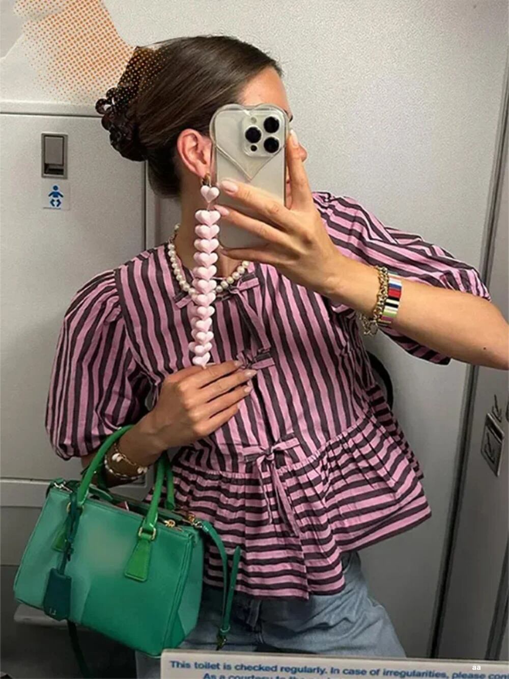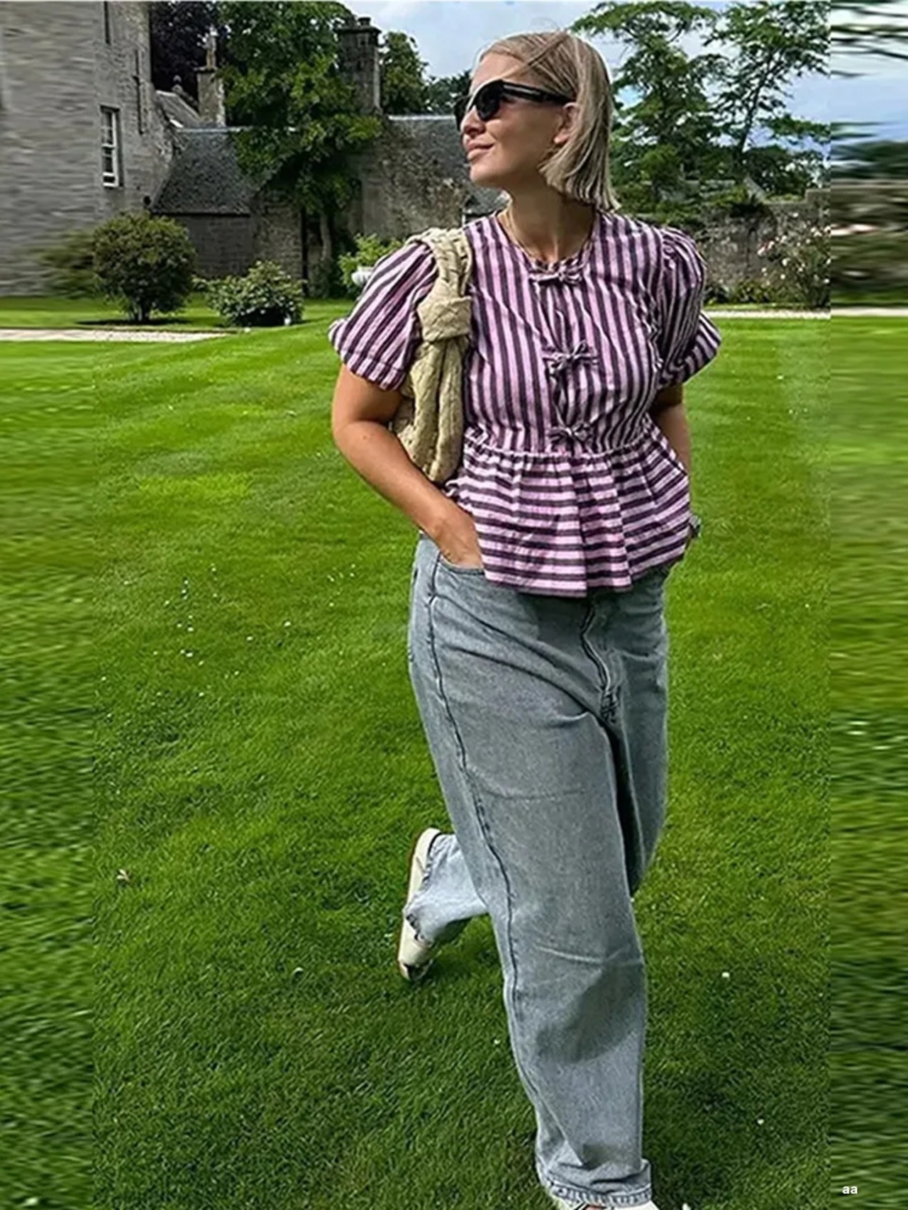 女性用半袖ラウンドネックブラウス,ストライプのレースアップブラウス,ラインシャツ,カジュアルファッション,春,夏,女性用トップス,2022 ボトム ボトムス ズボン T240619143130_02 | DOKO-ME