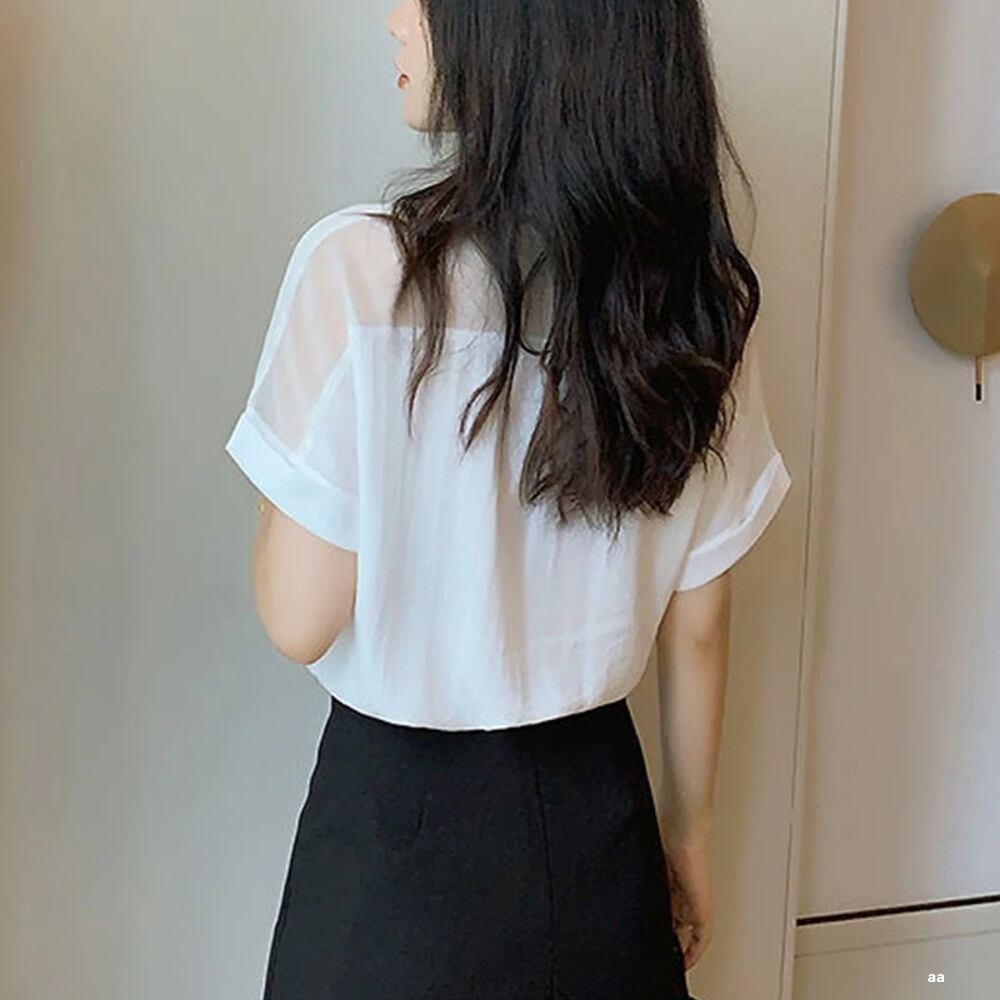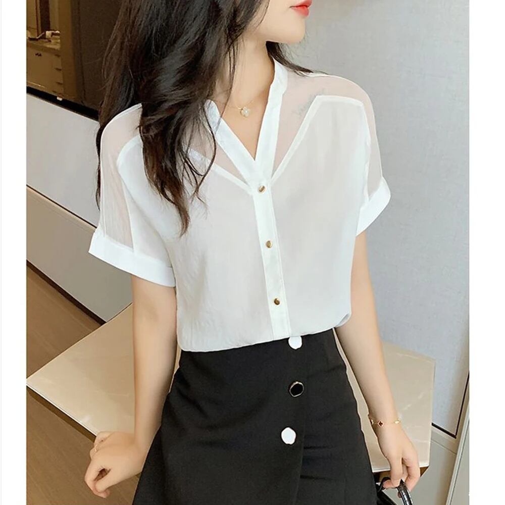 女性のカジュアルメッシュパッチワーク半袖シャツ、単色Vネックシフォンブラウス、エレガントなボタントップ、女性、春、秋、ファッション ボトム ボトムス ズボン T240619143145_02 | DOKO-ME