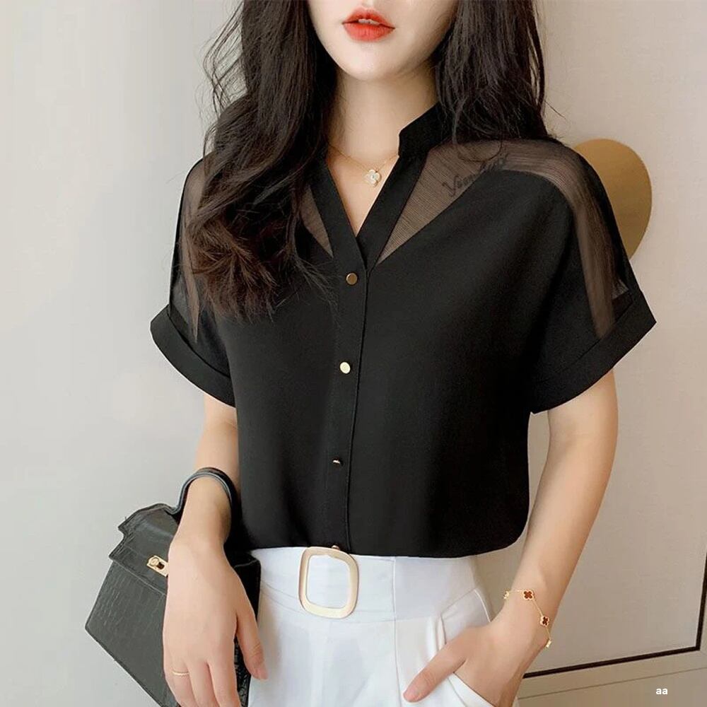 女性のカジュアルメッシュパッチワーク半袖シャツ、単色Vネックシフォンブラウス、エレガントなボタントップ、女性、春、秋、ファッション ボトム ボトムス ズボン T240619143145_03 | DOKO-ME