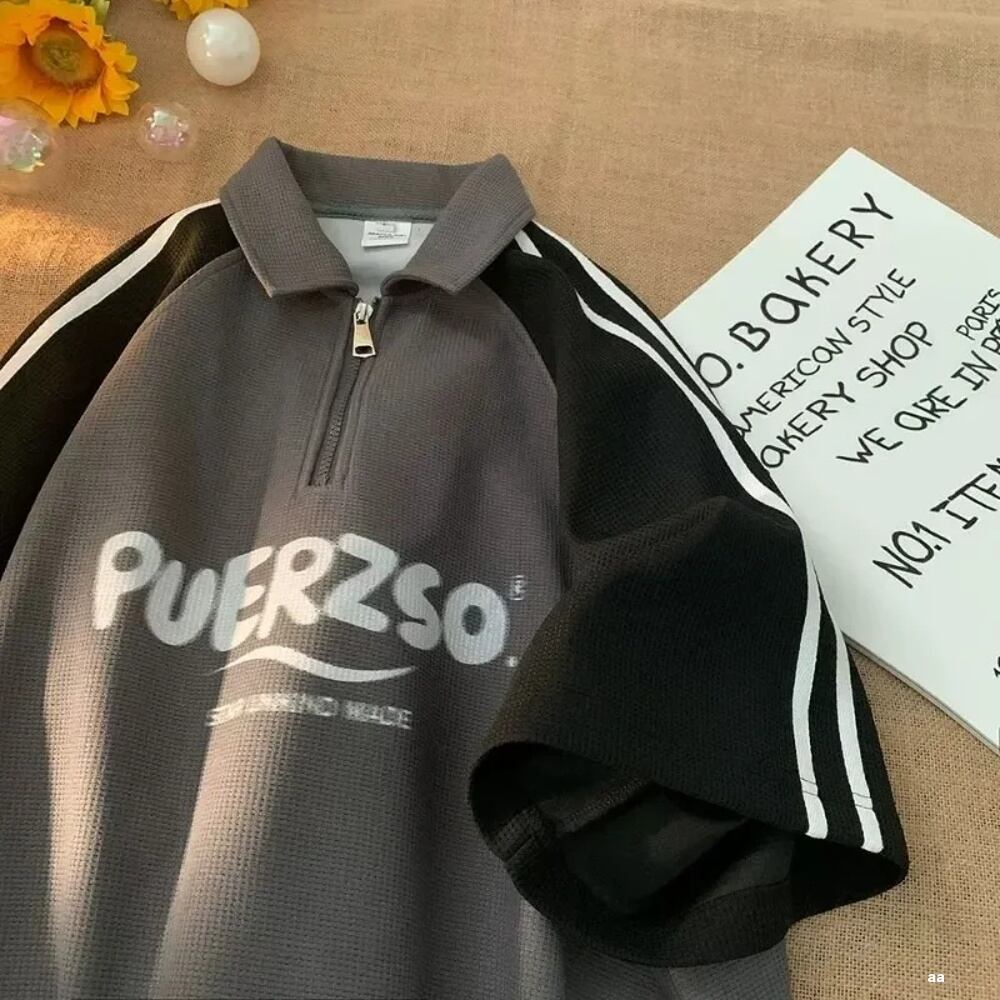 男性と女性のためのハーフジッパーポロシャツ,大きなカジュアルなTシャツ,スイムダウンカラーのラージサイズ,半袖,レタリング,夏 ボトム ボトムス ズボン T240619143153_01 | DOKO-ME