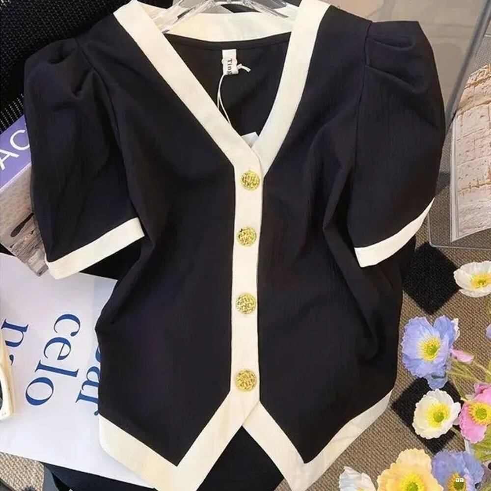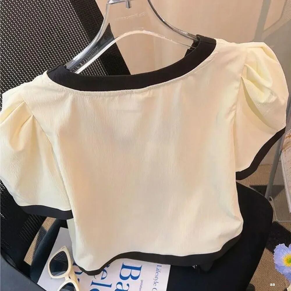 女性用半袖スプライスシャツ,フレンチスタイルシャツ,黒,白,ルーズ,多用途,デザイン,ファッショナブル,夏用 ボトム ボトムス ズボン T240619143455_02