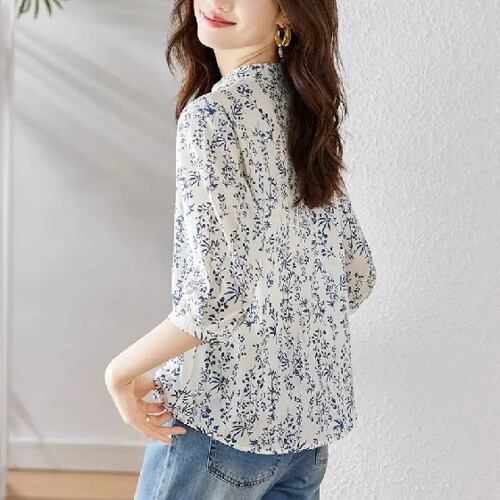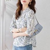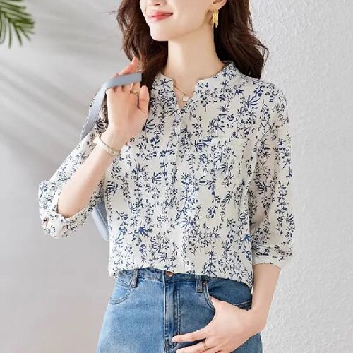 女性用フローラルプリントトップス,3/4スリーブ,カジュアルブラウス,ルーズコットンとリネンのブラウス,韓国のファッション,春と夏