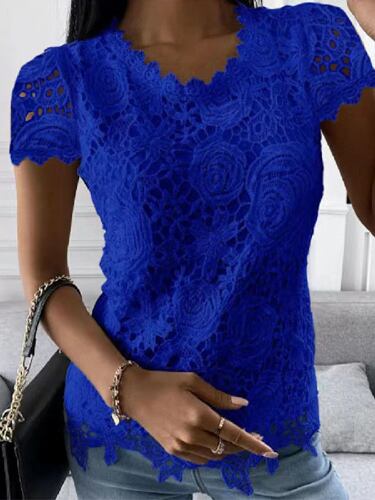 女性用レースパッチワークブラウス、Vネックトップ、半袖、olシャツ、LRFZ-9911、夏