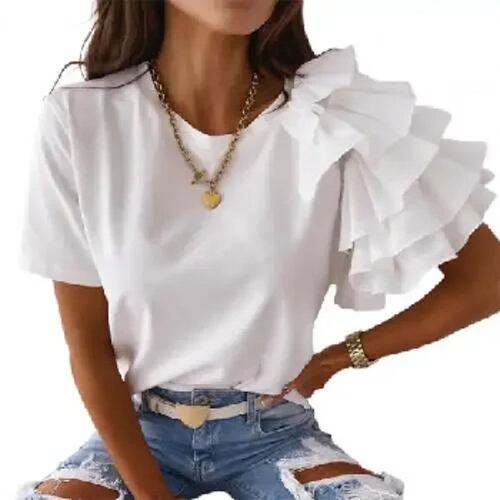 女性のためのエレガントな白い半袖ブラウス,無地,フリル付き,非対称,十分な,夏