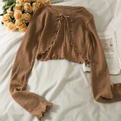 女性用長袖カーディガン,エレガントなトップス,レースアップ,リボン付き,韓国スタイル