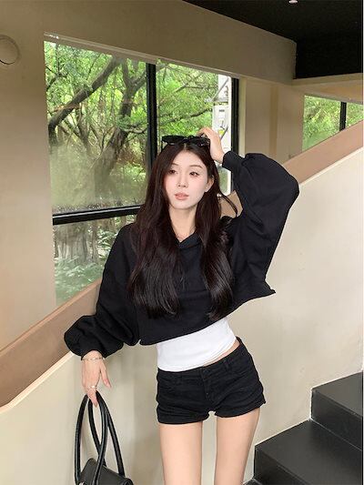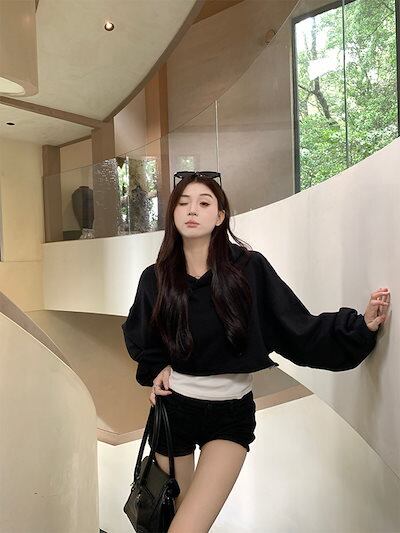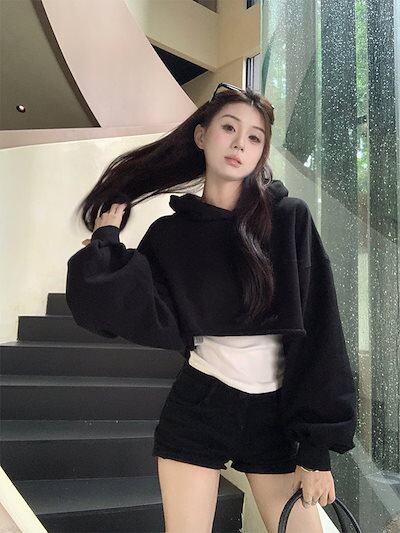 2024 秋冬トップス フード付き スウェット 長袖 丈短め 秋 黒 ブラック おしゃれ かわいい 韓国ファッション レディース お出かけ