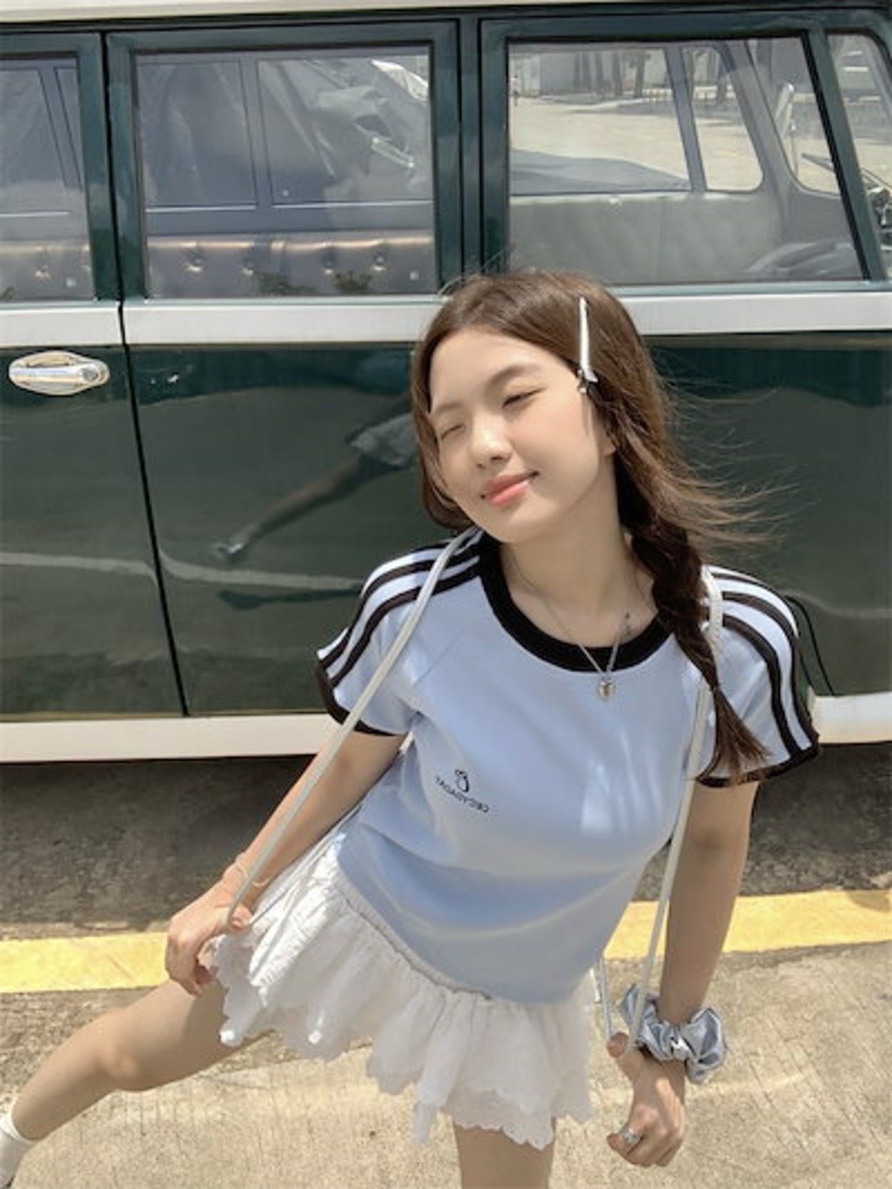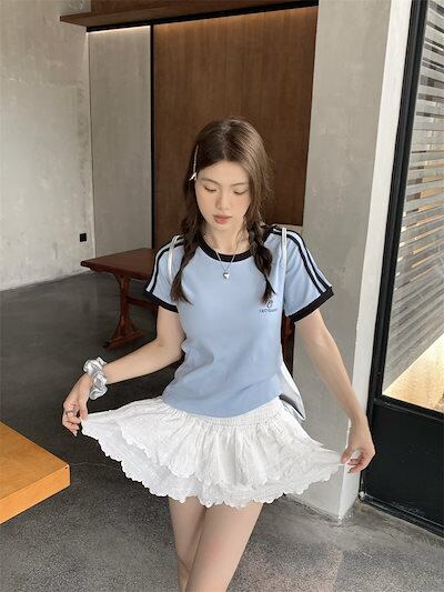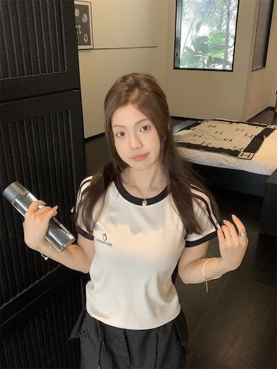 2024 春夏トップス 大人可愛い風半袖 Tシャツ 韓国 ラウンドネックロゴスリム かわいいへそ出し ショートおしゃれスリーブカジュアルサイドコーデ丈ファッション系レディースストリートお出かけ T | DOKO-ME
