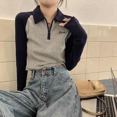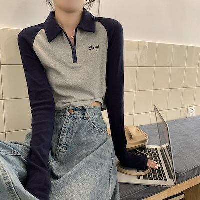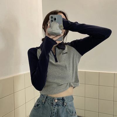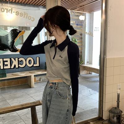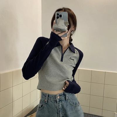 2024秋 長袖 Tシャツ ショート丈 カットソー トップス カジュアル 配色韓国系ストリートへそ出しK-POPタイトネックスリーブ 肌見せ T ファッションレディース かわいいハーフ衣装風冬トップス3 | DOKO-ME