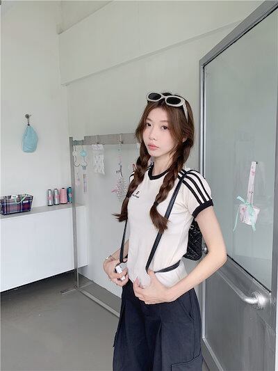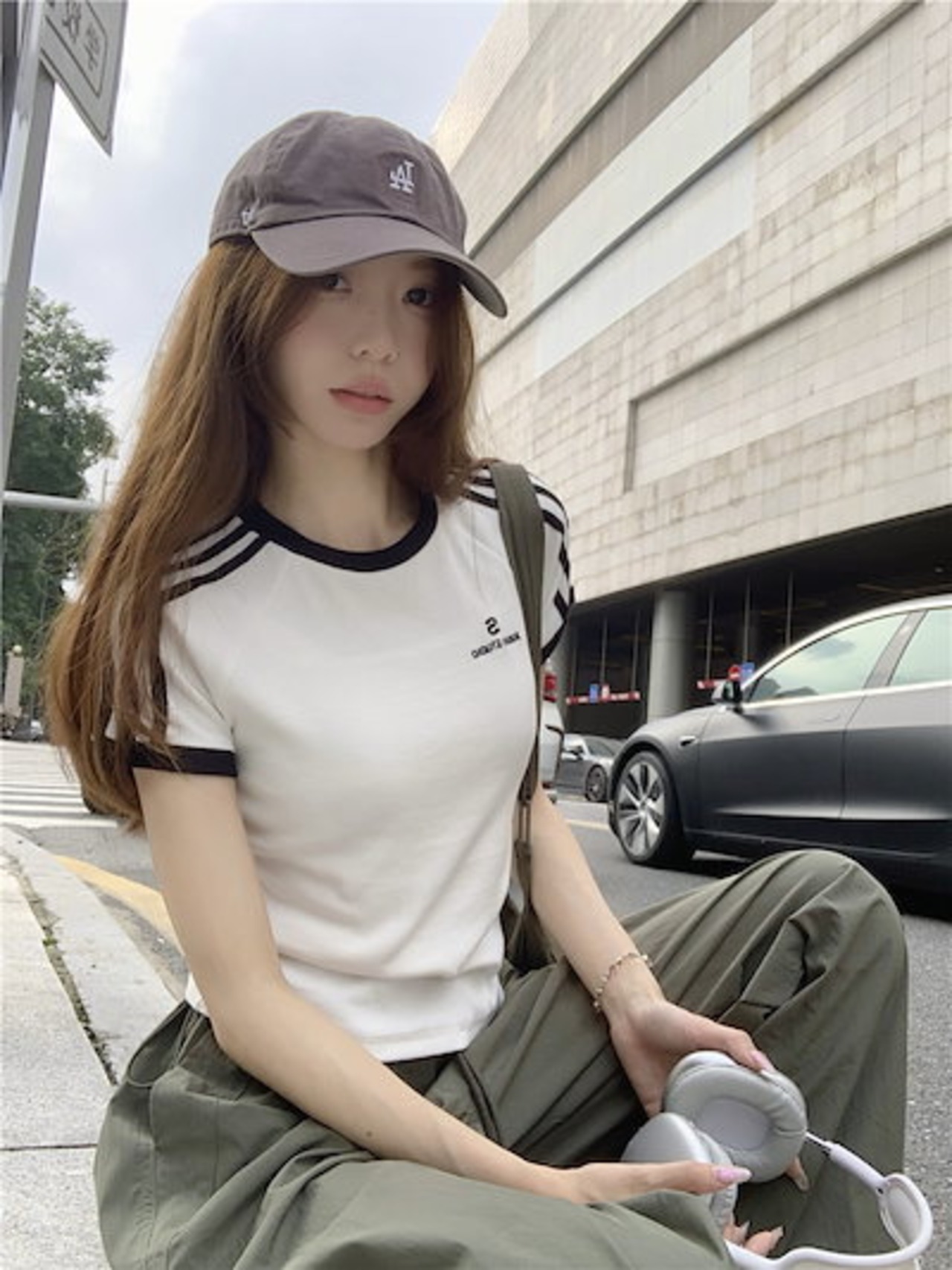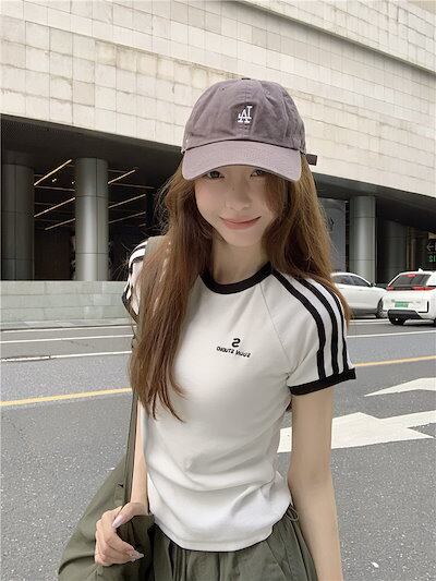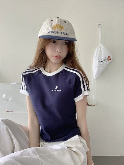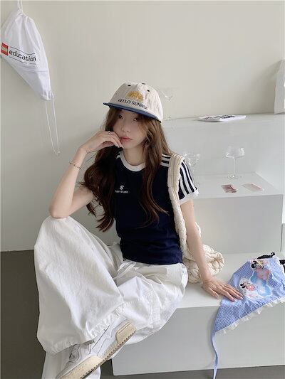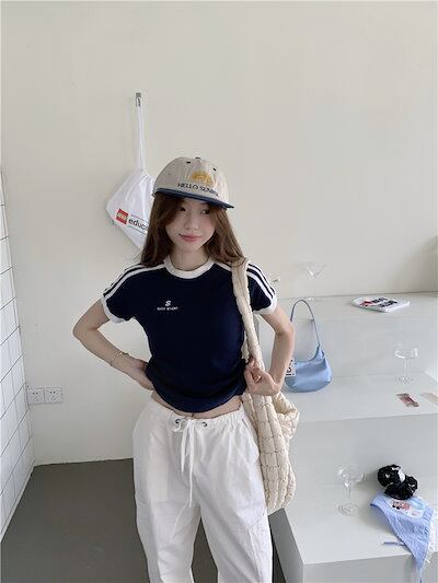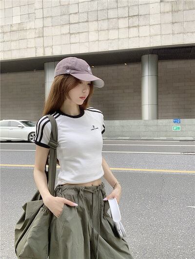 2024 春夏トップス 大人可愛い半袖 Tシャツ 韓国 ラウンドネックロゴスリム かわいいへそ出し ショート おしゃれスリーブ カジュアルサイドコーデ丈 ファッション系レディースストリートお出かけ T | DOKO-ME