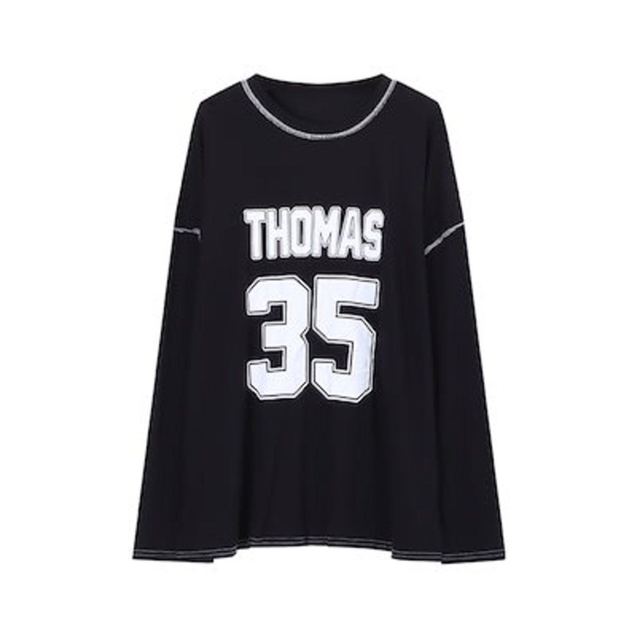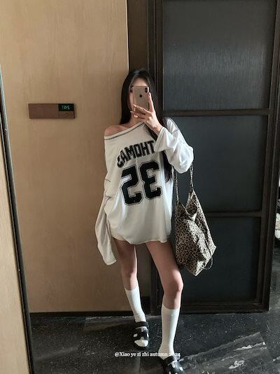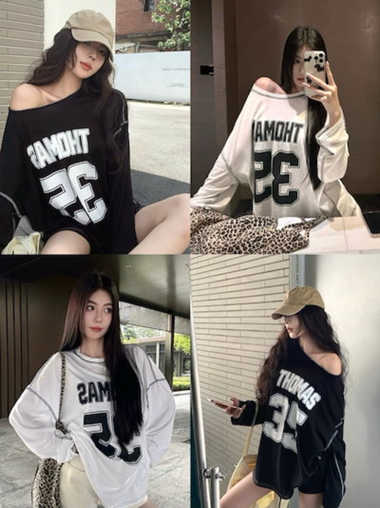 秋韓国可愛い風トップス Tシャツ ファッション系 長袖 プリント ルーズ サイド ペイントシルエットゆったり丈 レディースサイズ韓国Vネック おしゃれ カジュアル メンズライク T | DOKO-ME