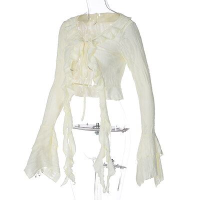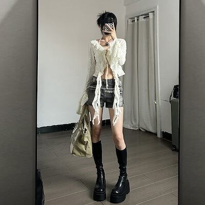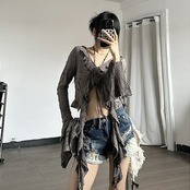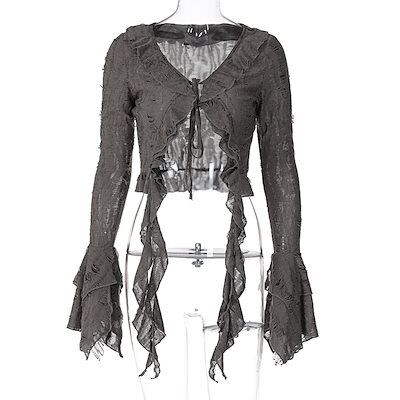 2024 夏秋 韓国 ショート丈 変形 カーディガンブラウストップスレディース長袖へそ出し UVカット 羽織り きれいめライトニットOLネックカジュアルフレンチフェミニンファッションフィッシュ系 | DOKO-ME