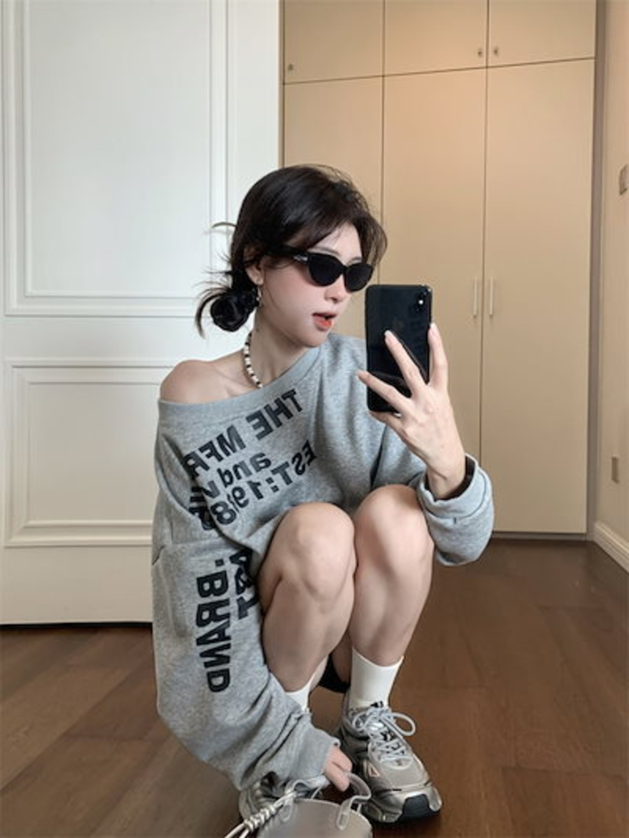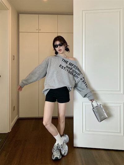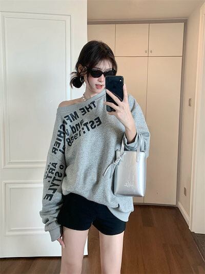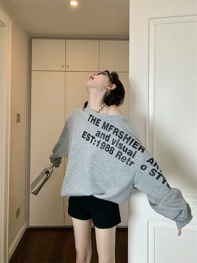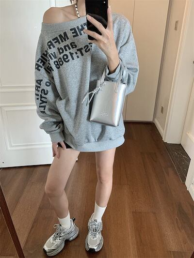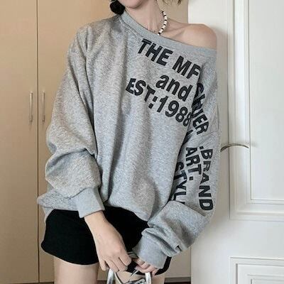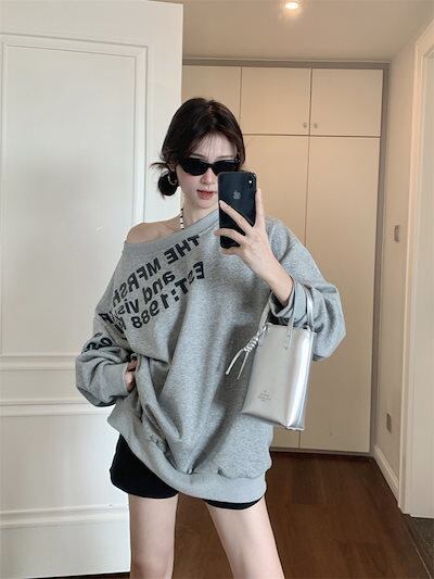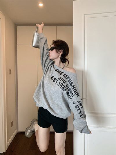 2024夏トップス スウェット 長袖 ワンショルダー 肩見せ 英語 プリント ゆったり 細見え 夏 グレー おしゃれ かわいい 韓国ファッション レディース お出かけ