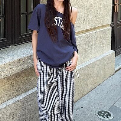 2024夏トップス Tシャツ 半袖 ワンショルダー 英語 肩見せ ゆったり 細見え 夏 ネイビー おしゃれ かわいい 韓国ファッション レディース お出かけ