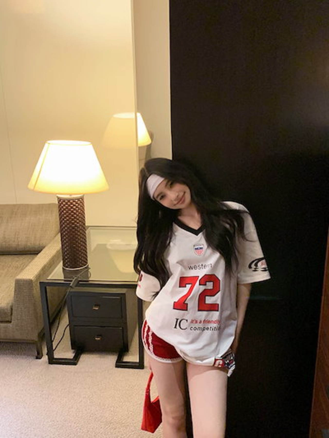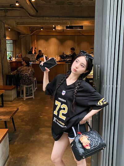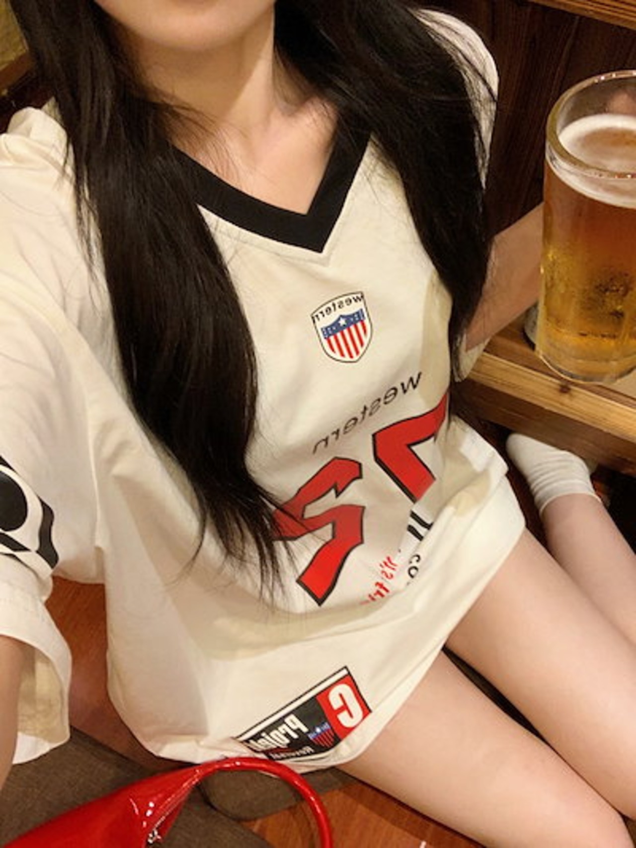 2024 夏 韓国可愛い風トップス Tシャツ ファッション 半袖 スリムフィット サイドペイントシルエットゆったり丈 休日レディースサイズ韓国Vネック おしゃれ カジュアル メンズライクフットシャツ | DOKO-ME