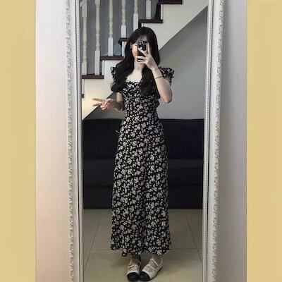 2024夏新品!!!夏 人気 韓国ファッション 花柄 ウエスト引き締め ロングワンピース ドレス フレンチ ブラック 通勤 通学