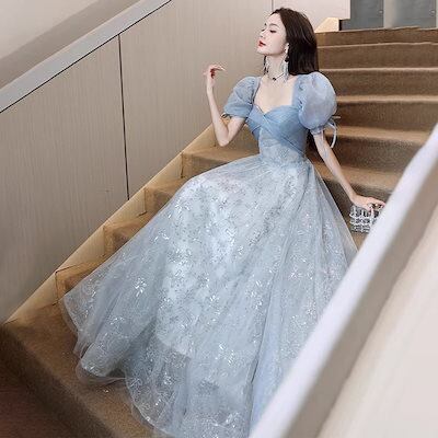 2024新品追加パーティドレス ブルー ワンピース 韓国ファッション プリンセススカート 卒業式 結婚式 誕生日 演奏会 花嫁 司会 ホスト パーティー