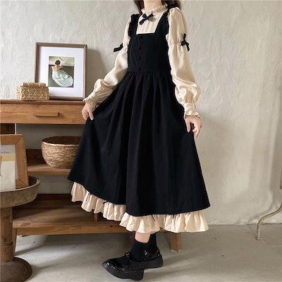 メイド服 新作COS 二次元 ロリータストラップスカート春秋長袖ワンピース日系洋風ゆったりロングスカート レディース 韓国