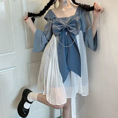 春夏の優しい女の子改良漢服ワンピース学生 可愛い ロリータ 可愛いリボン角襟ハイウエストプリーツスカートサンタコスプレ