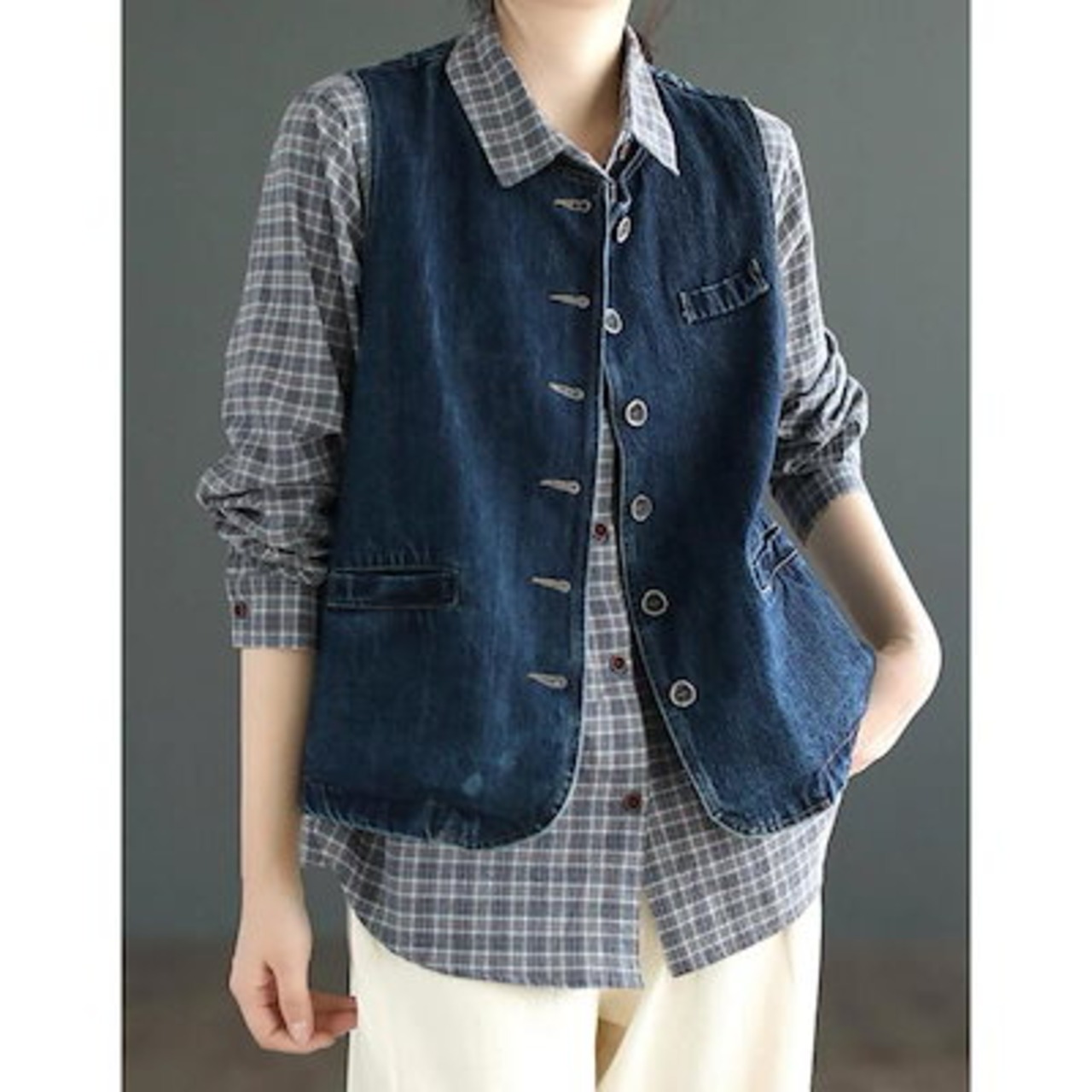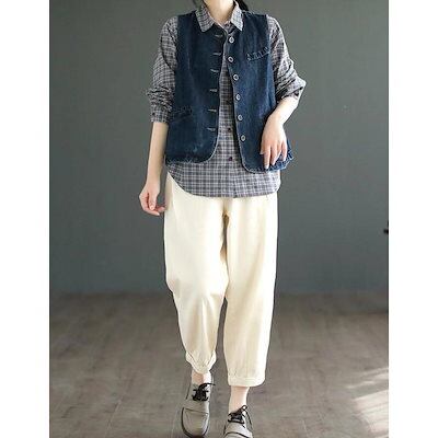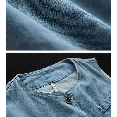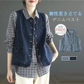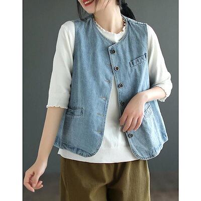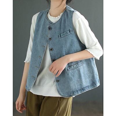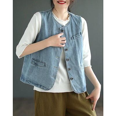 デニムベスト レディース デニム ジレ クルーネック 羽織 前開き 春 夏 秋 カジュアル 無地 レイヤード 重ね着 森ガール ナチュラル きれいめ
