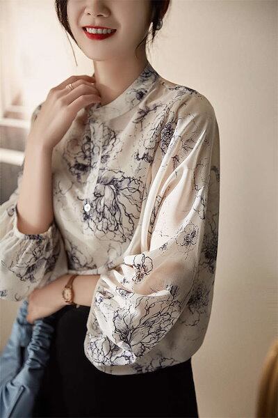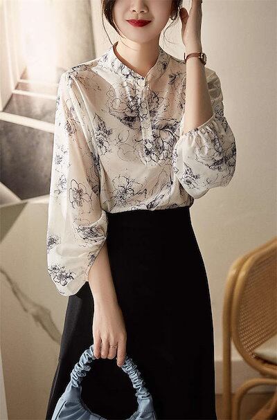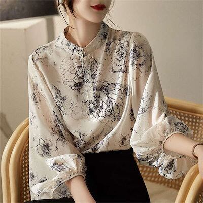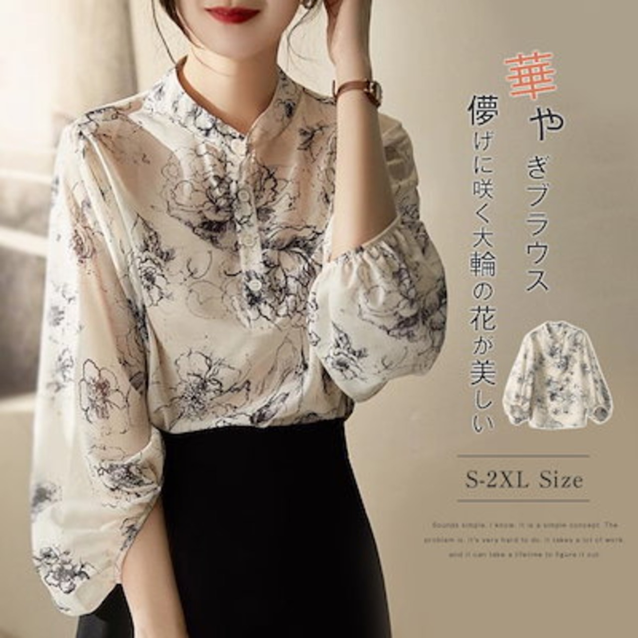 シャツ ブラウス トップス レディース 春夏 トップス シャツブラウス 絵画風 フラワープリントブラウス 立ち襟 パフスリーブ シースルー 薄手 爽やか 可愛い 七分袖 おしゃれ 通勤 ゆったり 30 | DOKO-ME