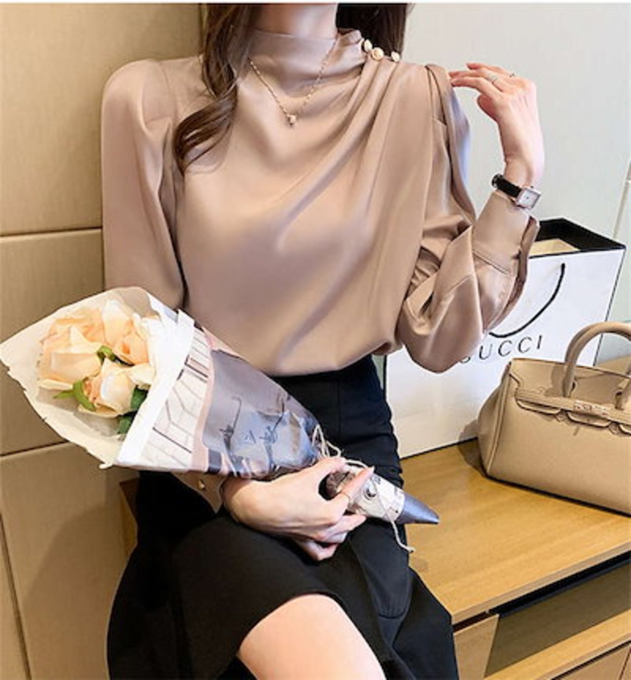ブラウス レディース 長袖トップス シフォン シャツ インナー レディース 春 秋 プチハイネック 二の腕カバー きれいめ エレガント ビジネス オフィスウェア 無地 ゆったり オシャレ ギャザー 上 | DOKO-ME