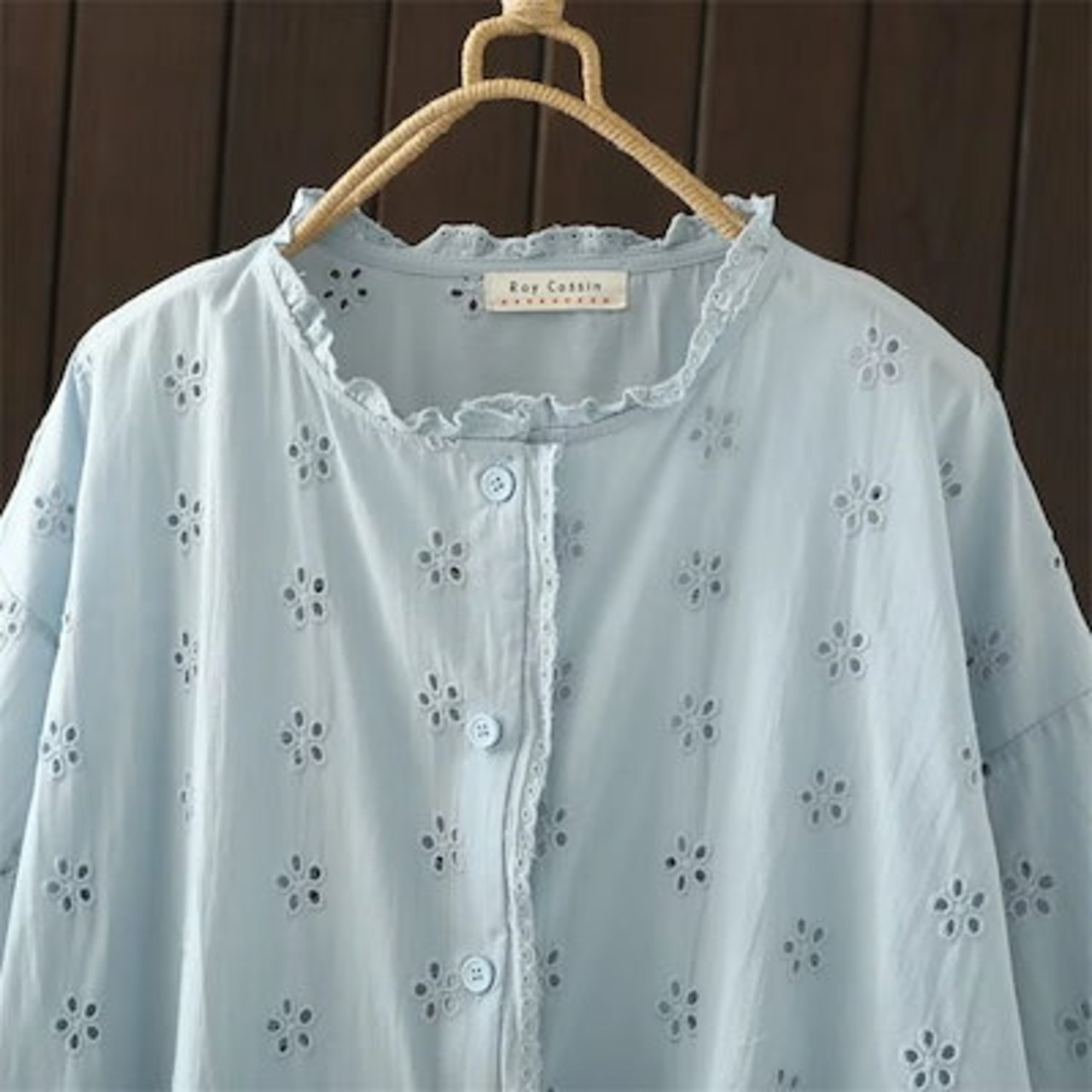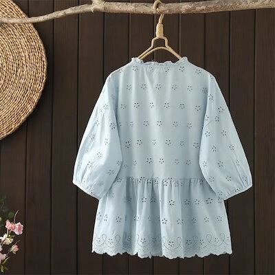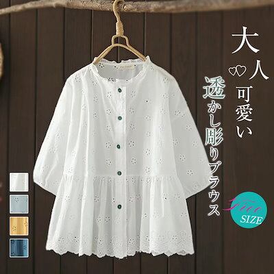 シャツ ブラウス トップス レディース コットンレースブラウス ボリューム袖 綿100% チュニック 夏 花柄 五分袖 刺?花柄 レース フリル襟 トップス 立ち襟シャツ 森ガール キレイめ カジュ | DOKO-ME