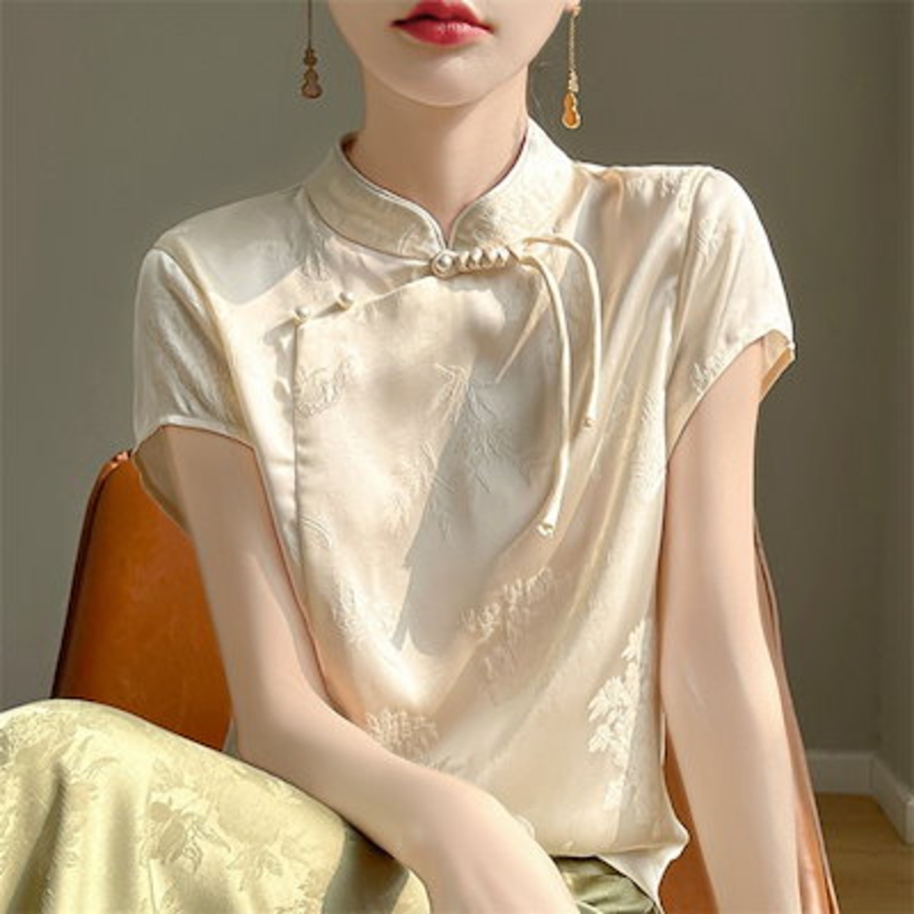 ブラウス チャイナ風 レディース 半袖 トップス 夏 薄手 立ち襟 チャイナトップス シルク風 花柄 刺繍 シャツ スタンドカラー プルオーバー チャイナボタン ゆったり エスニック 光沢 カジュアル | DOKO-ME