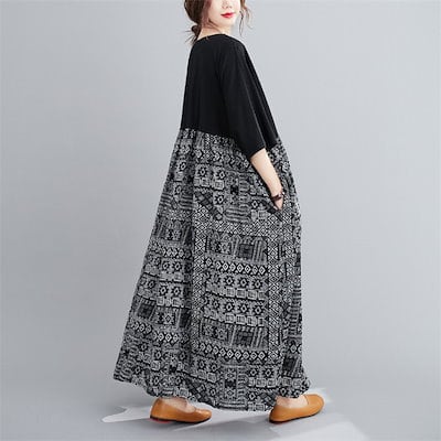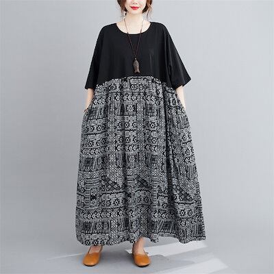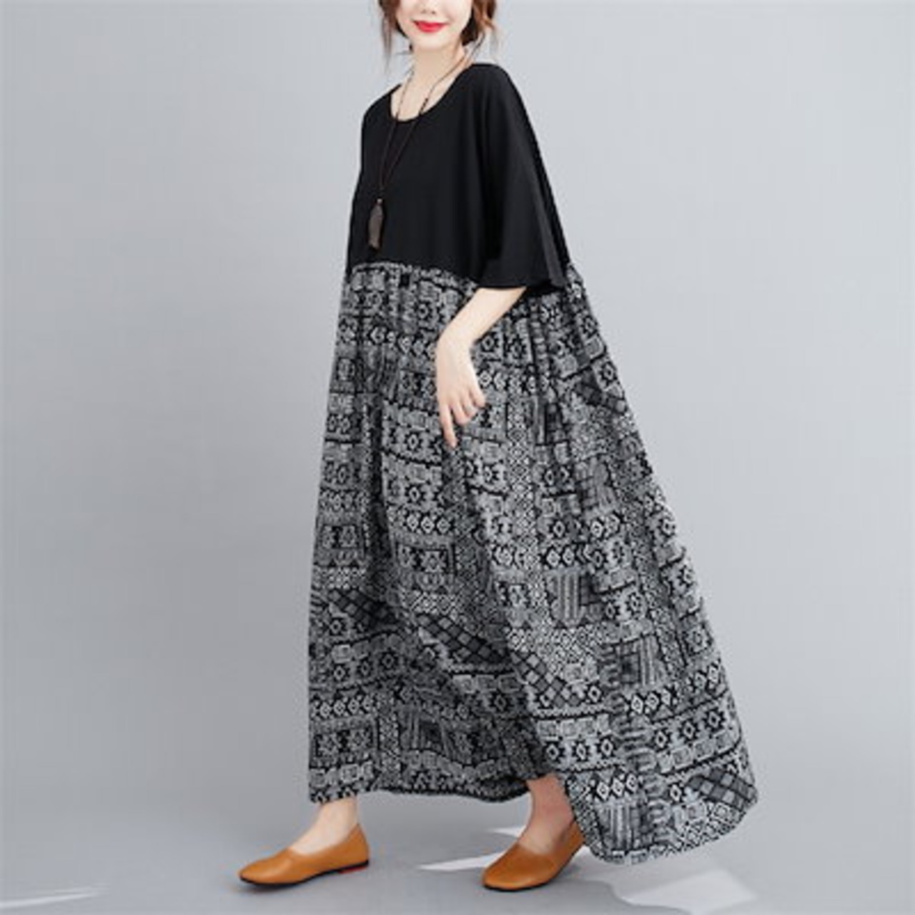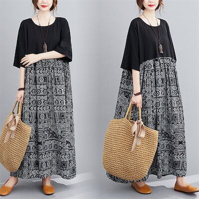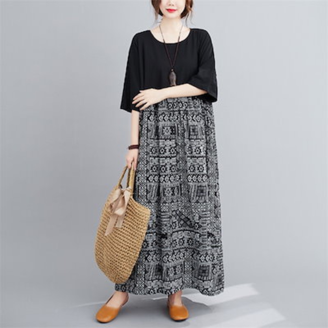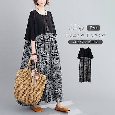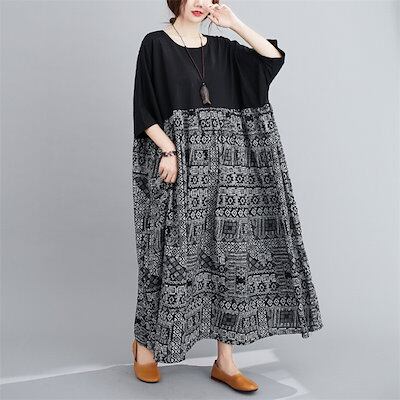 ワンピース マキシ丈 大きいサイズ 半袖 レディース 綿麻 ロングワンピース ゆったり リネン コットン 薄手 夏 キレイめ ゆったり フレア 体型カバー エスニック ルーズ ナチュラル 着痩せ 大人 | DOKO-ME