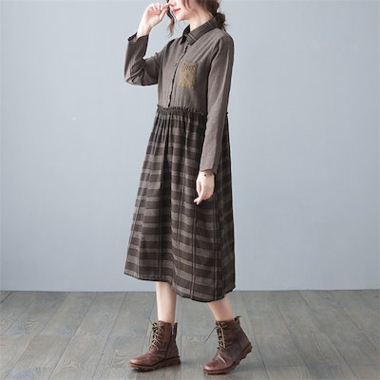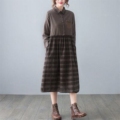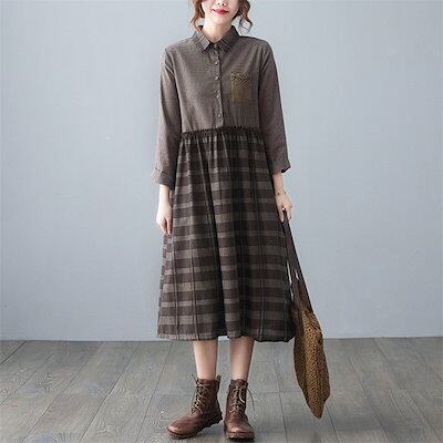 チェックシャツワンピース 長袖 レディース 秋 冬 ロングシャツワンピース ギンガムチェック 大きいサイズ ロングワンピ ゆったり 体型カバー ミモレ丈 綿混 ポケット カジュアル 大人 着痩せ 春 | DOKO-ME