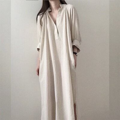 大きいサイズ レディース マキシワンピース ゆったり ワンピース ロング丈 ワンピース Vネック 長袖 無地 ゆったり 体型カバー マキシ丈 ロングワンピース 長袖 カジュアル きれいめ ウエストリ | DOKO-ME