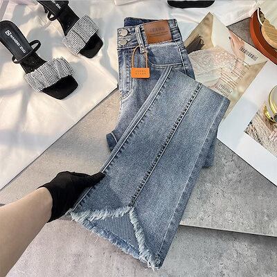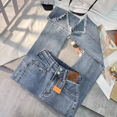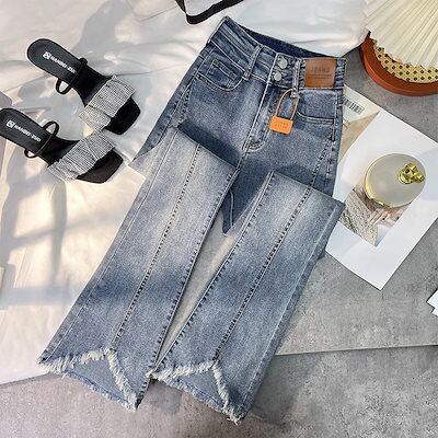 デニムパンツ女性2024春と秋の新しいハイウエストの薄い毛むくじゃらのエッジドラッグ地面フレアズボン馬蹄パンツ