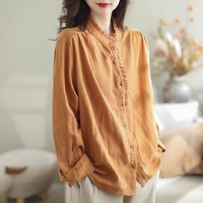 今っぽシアーシャツ綿麻の長袖シャツの女性の新しいカジュアルなブラウススプライシングマッチ女性のカーディガンシャツ