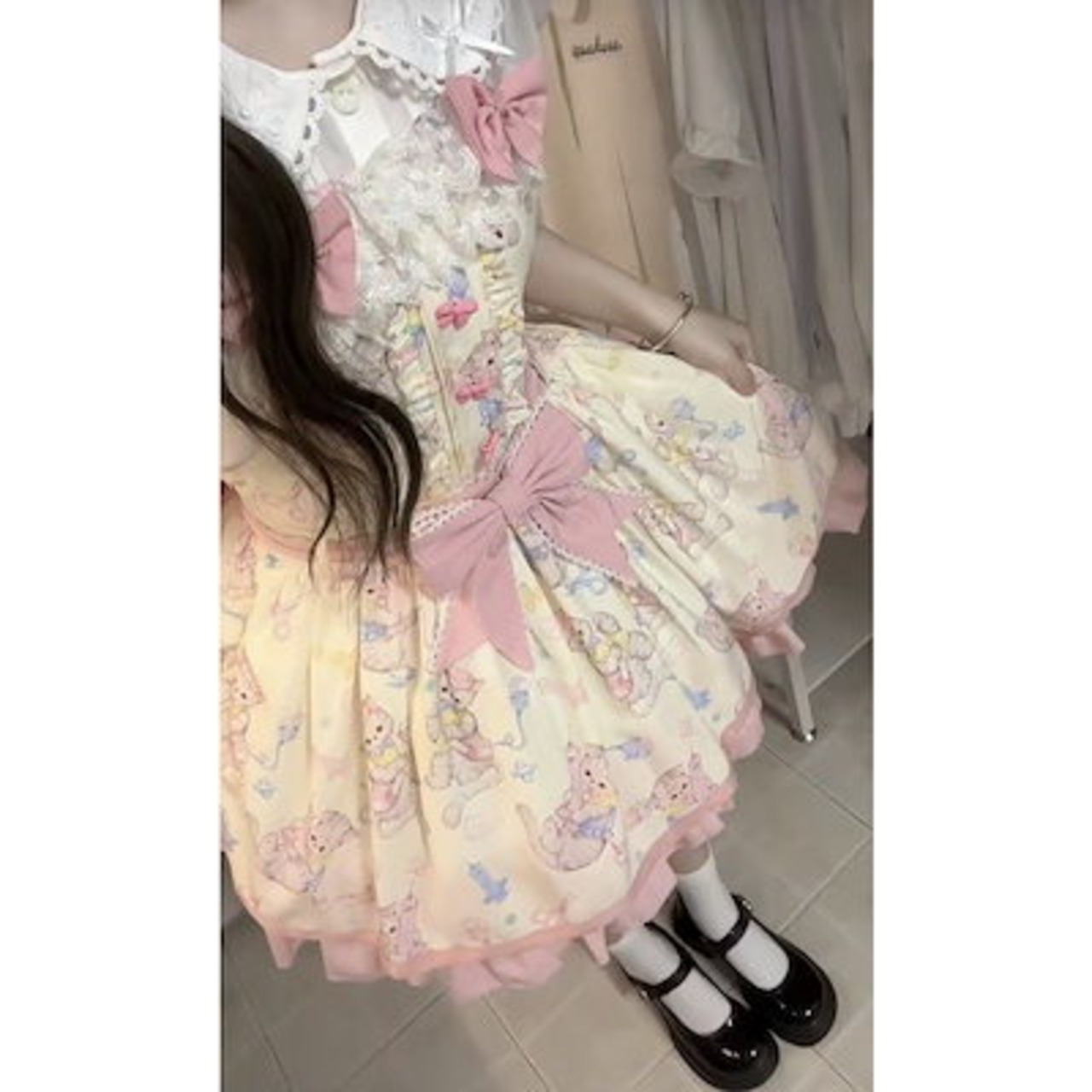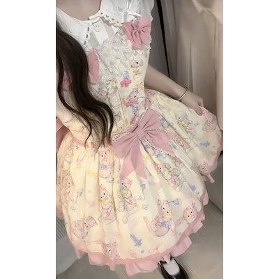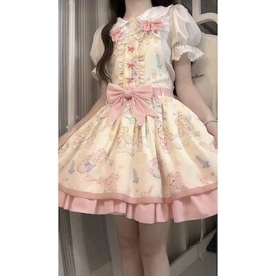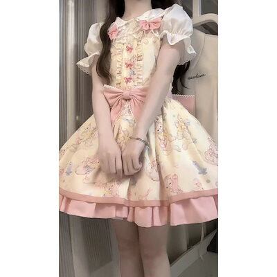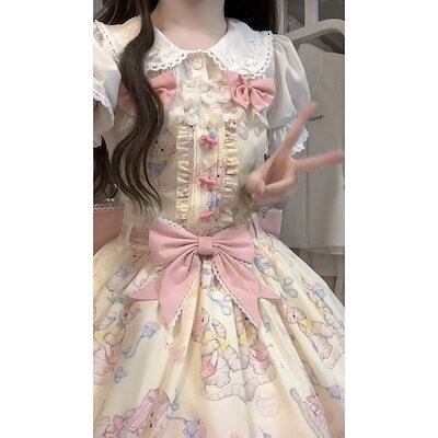 2024 ロリータ ドレス かわいい少女シャツリボンパッチワークプリントストラップスカートセット コスプレ ワンピース ロリータワンピース